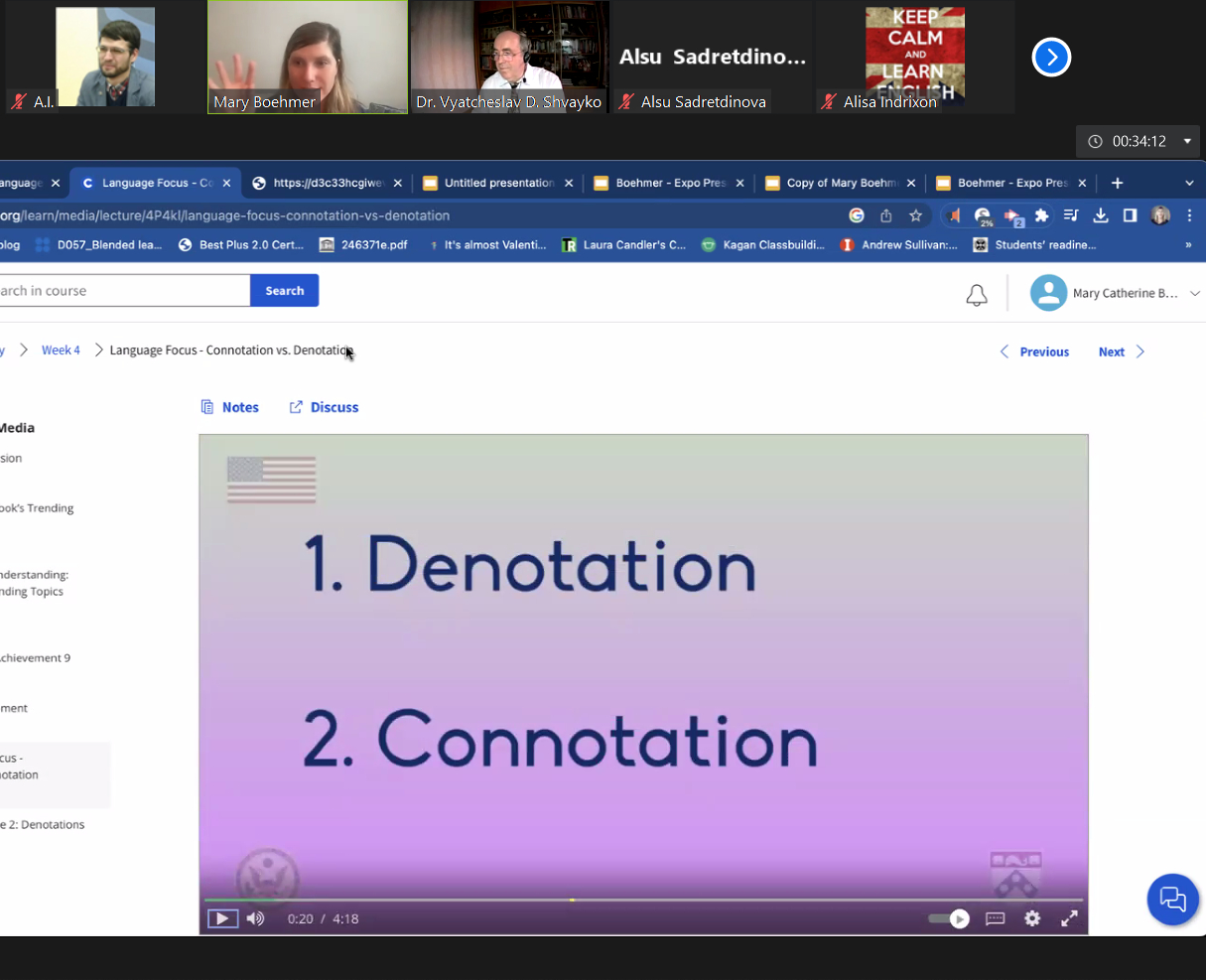26 апреля 2023 года в рамках очередной онлайн встречи клуба учителей английского языка (организатор: АНО ДО "Интерколледж") к.филол.н., доцент кафедры межкультурной коммуникации и перевода В.Д. Швайко и старший преподаватель кафедры иностранных языков А.И. Шагапов приняли участие в онлайн семинарах носителей языка “Using a Media Literacy Lens to Analyze Diversity in English Texts, Movies, and More” и “Using Improvisation to Motivate Students in the EFL Classroom”. В роли докладчиков выступили преподаватели Интерколледжа Mary Catherine Boehmer и Jeremiah David Savage.