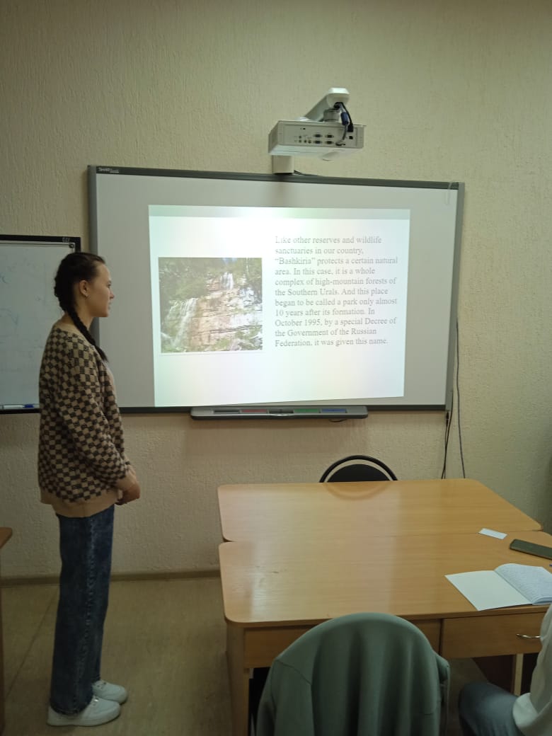 На 6-ой учебной неделе студенты первого курса (ПОТЯ_РЯ-11-23) под руководством доцента кафедры иностранных языков С.М. Хантимирова организовали и провели тематический вечер “About our native republic in English”. Были прочитали интересные доклады на английском языке, сопровождавшиеся красочными презентациями. Тематика выступлений охватывала многие стороны жизни нашей республики. Участники мероприятия (в т.ч. иностранные студенты, обучающиеся в БГПУ)  смогли узнать о животном мире Башкирии, об известных людях (композиторах и спортсменах), природном парке «Иремель», мечети «Ляля-Тюльпан», санатории «Красноусольский», Павловском водохранилище, водопадах республики и т.д. Доклады вызвали живой интерес у присутствующих. В конце мероприятия выступающие ответили на вопросы.