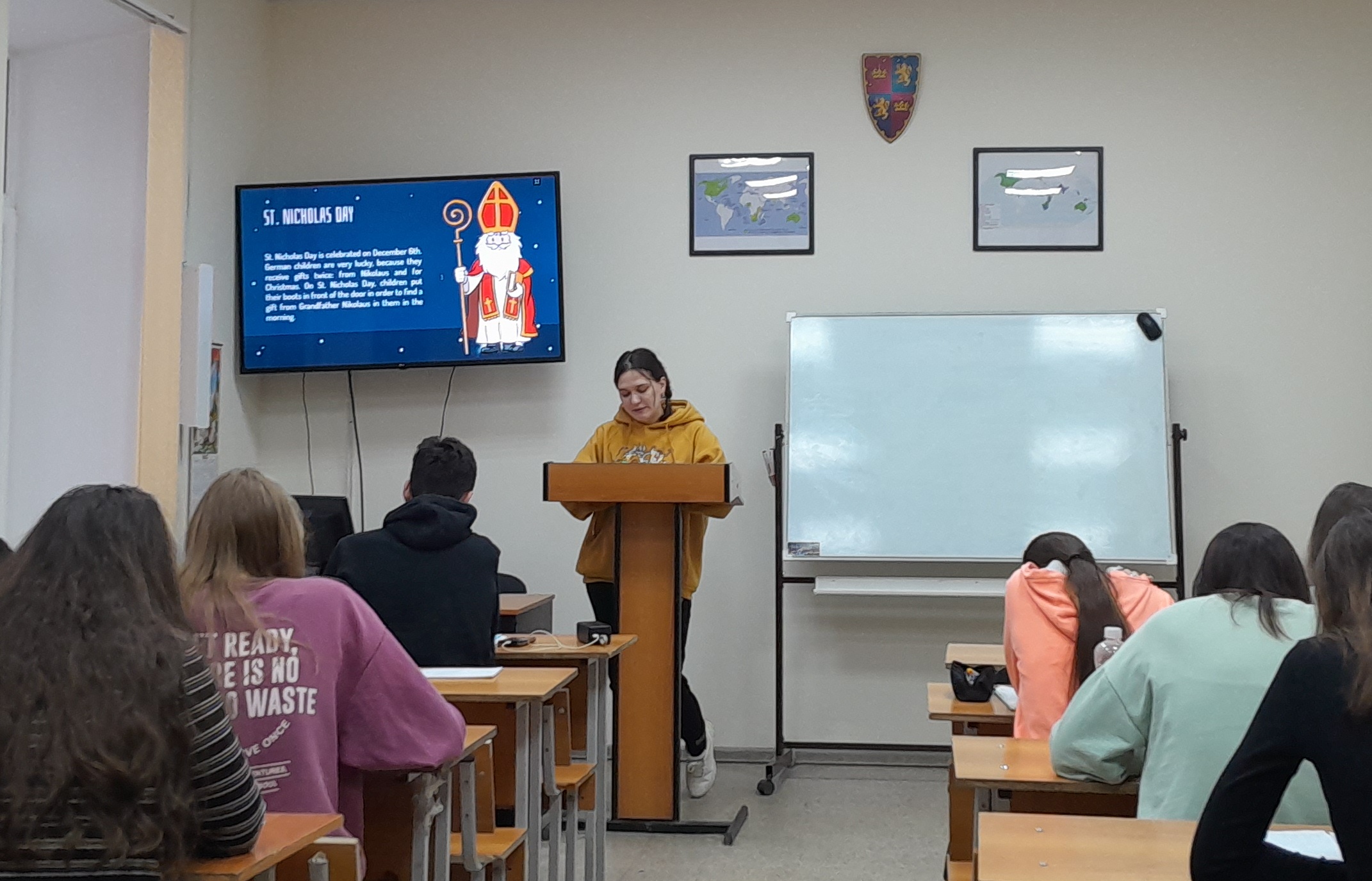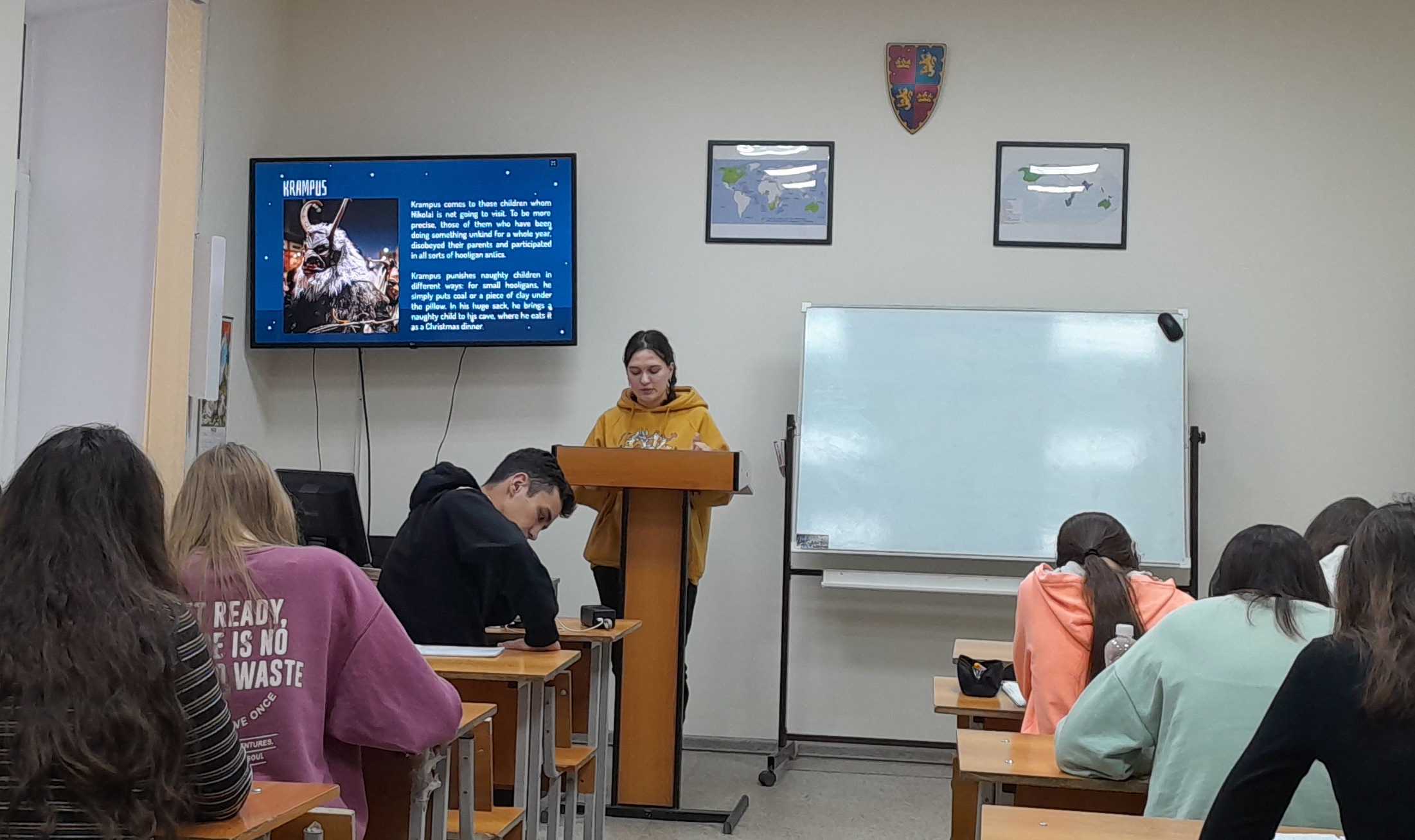 На 15-ой учебной неделе на английском языке преподавателями кафедры было организовано и проведено мероприятие «Санта-Клаус и другие зимние фольклорные персонажи» (“Santa Claus and other winter folkloric characters”). В докладах студентов с позиций междисциплинарного подхода была рассмотрена история появления некоторых зимних персонажей, таких как, например, Санта Клаус, Кнехт Рупрехт и Крампус. В сравнительно-сопоставительном аспекте была также проанализирована специфика образов т.н. рождественских дарителей (“Christmas gift-givers”), которые встречаются в фольклорном наследии разных народов мира. Данное мероприятие, несомненно, расширило знания студентов в рамках предметных областей страноведения и лингвофольклористики и способствовало развитию межкультурной компетенции.