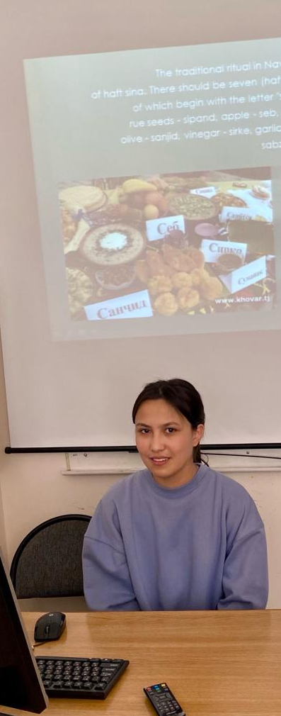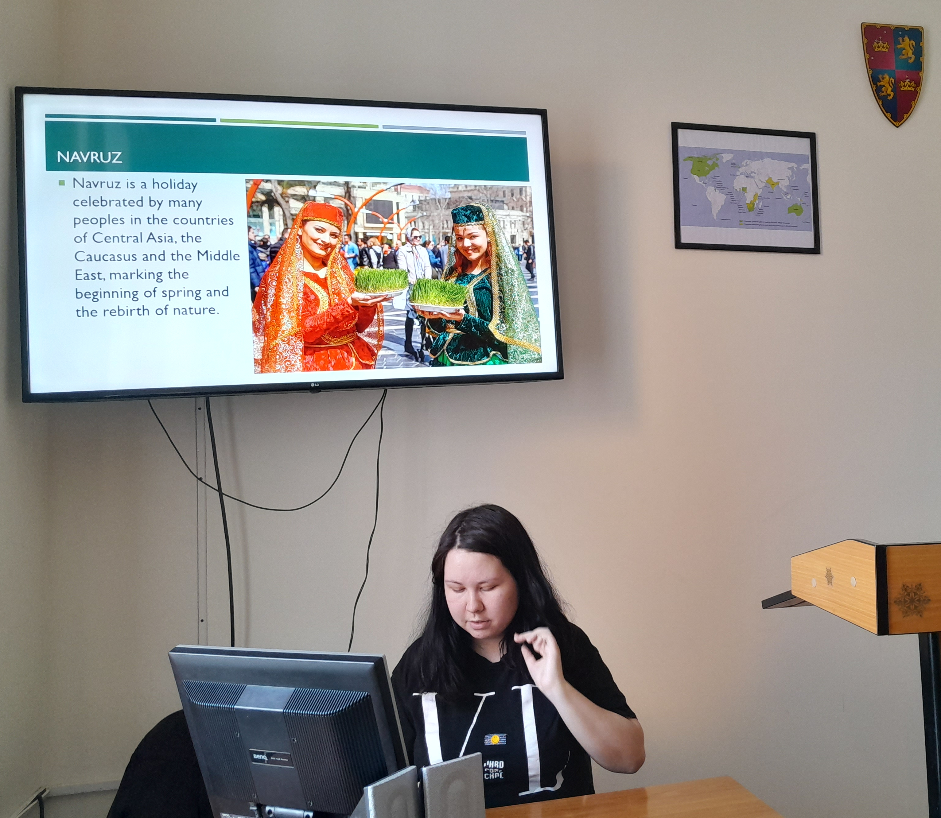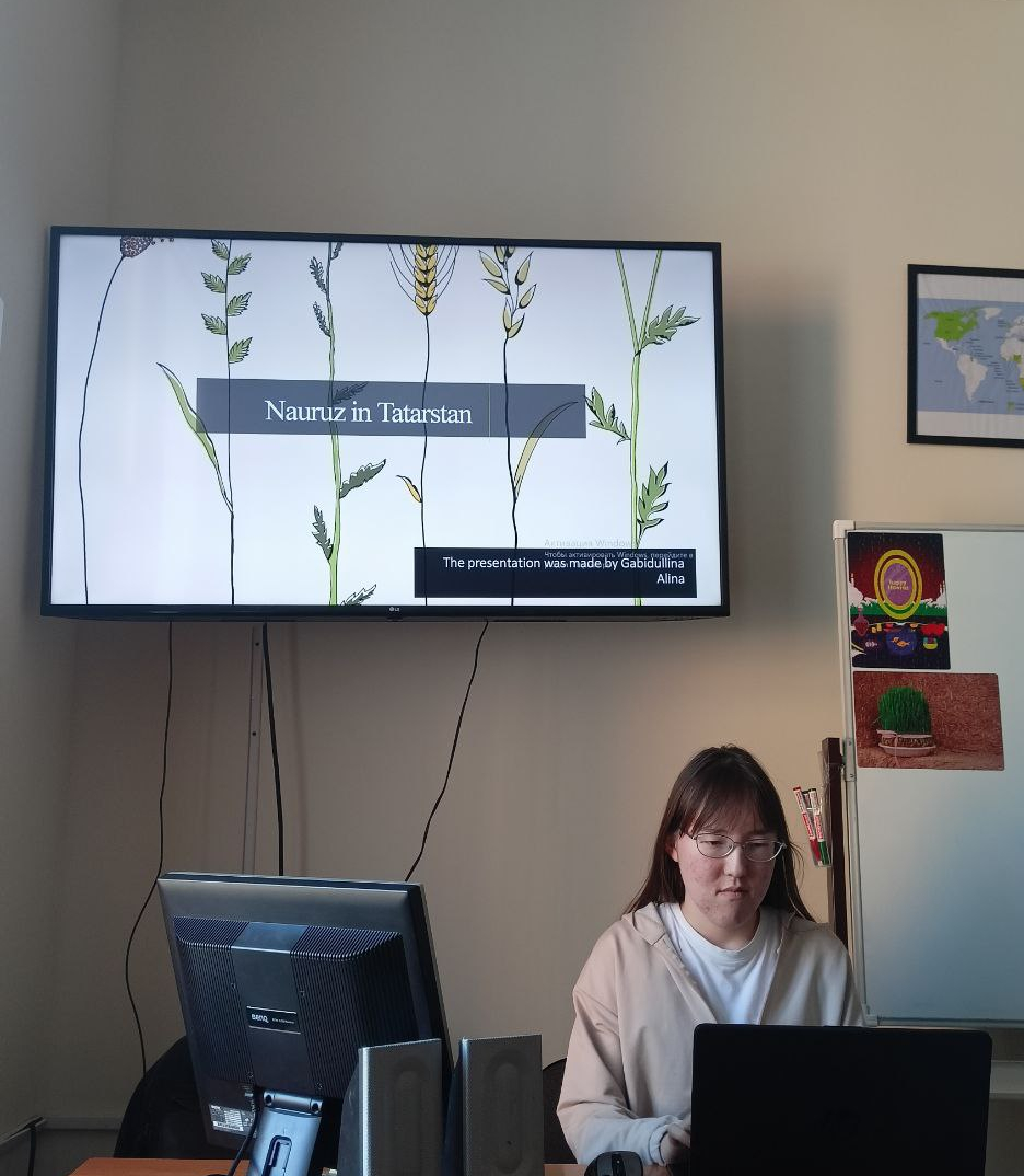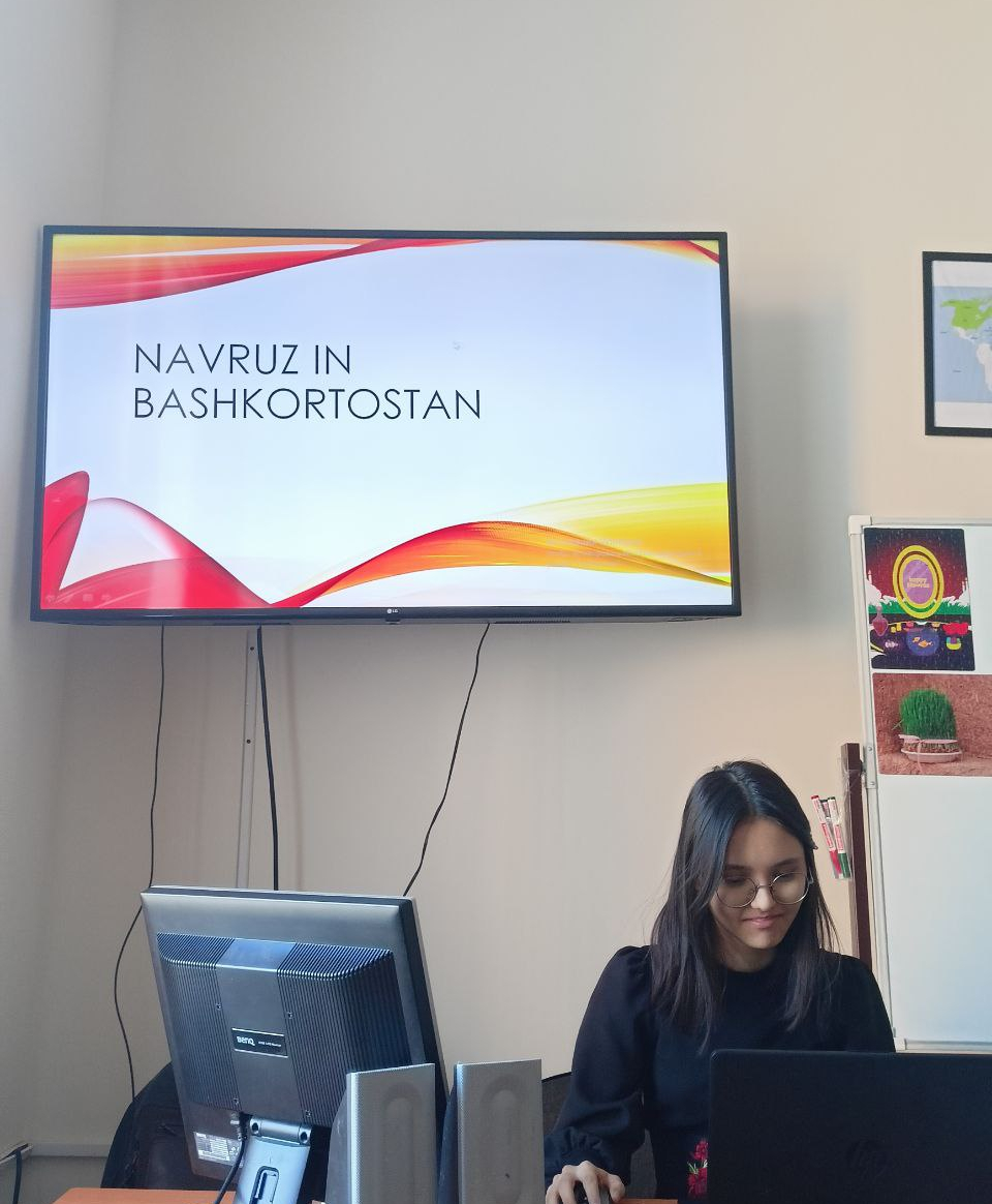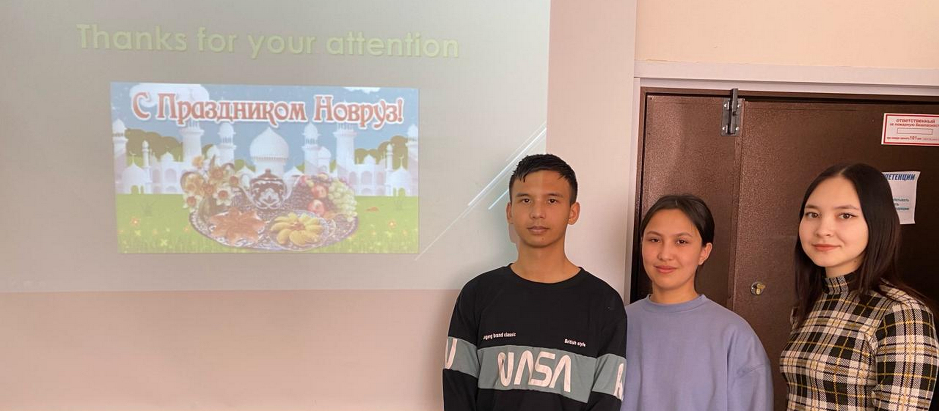 В мероприятии кафедры иностранных языков в дистанционном формате приняли участие и студенты Республики Казахстан. Например, Айым Тактарбекова (рук.: Серик Кульпеисов, Костанайский социально-технический университет им. академика З. Алдамжар) подготовила информативную и красочную презентацию, раскрывающую особенности празднования Навруза в Средней Азии.