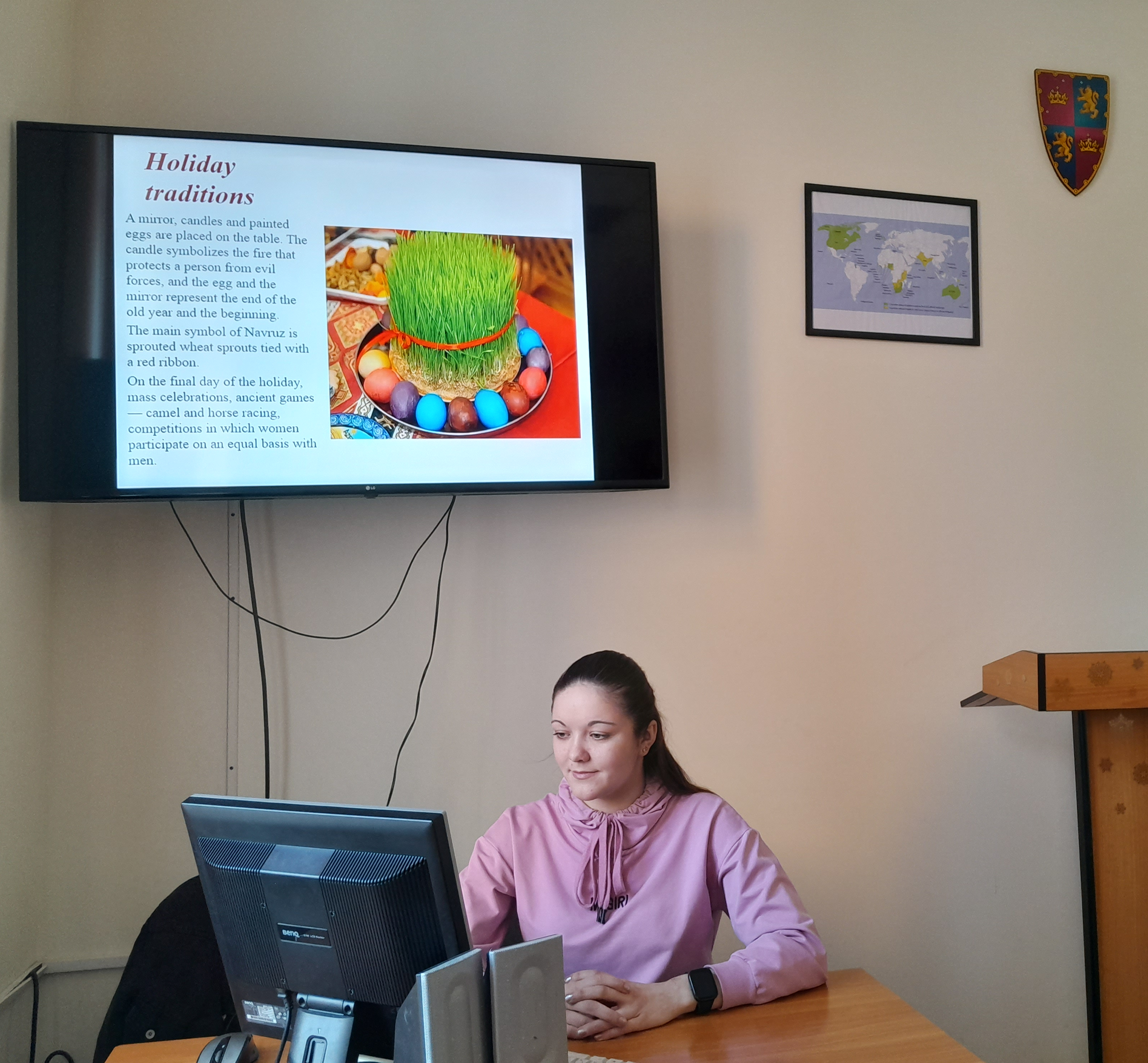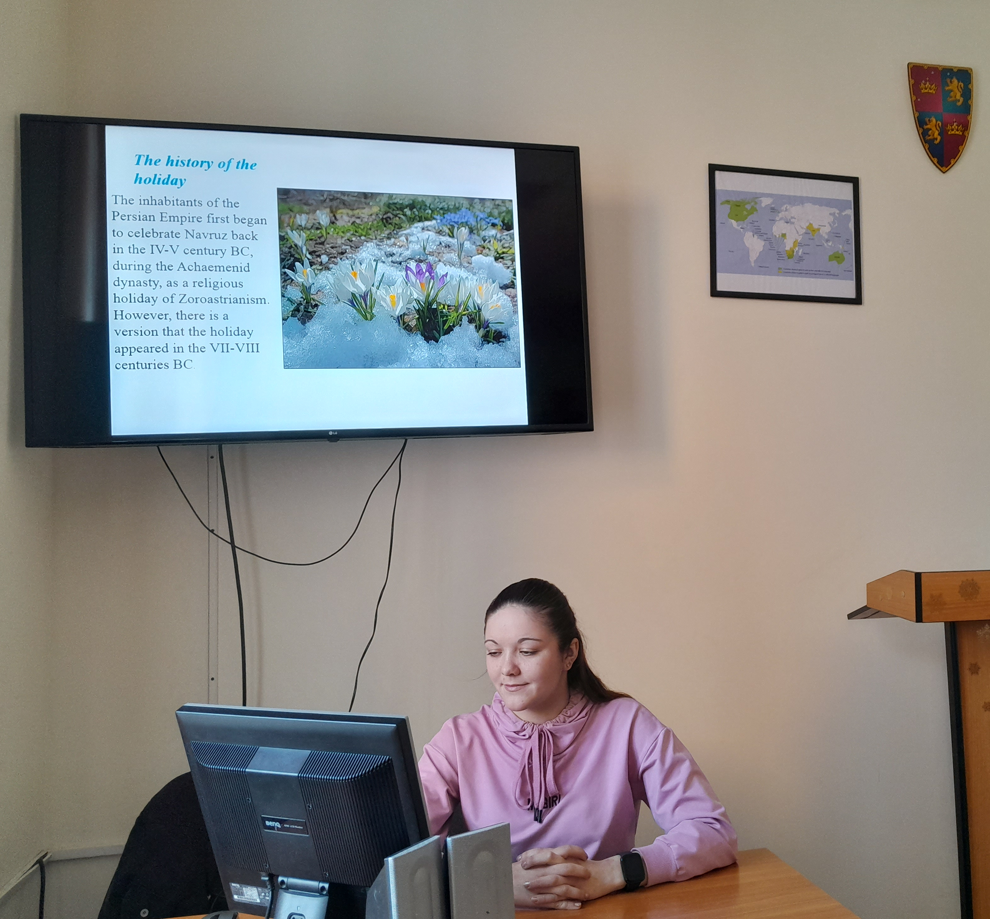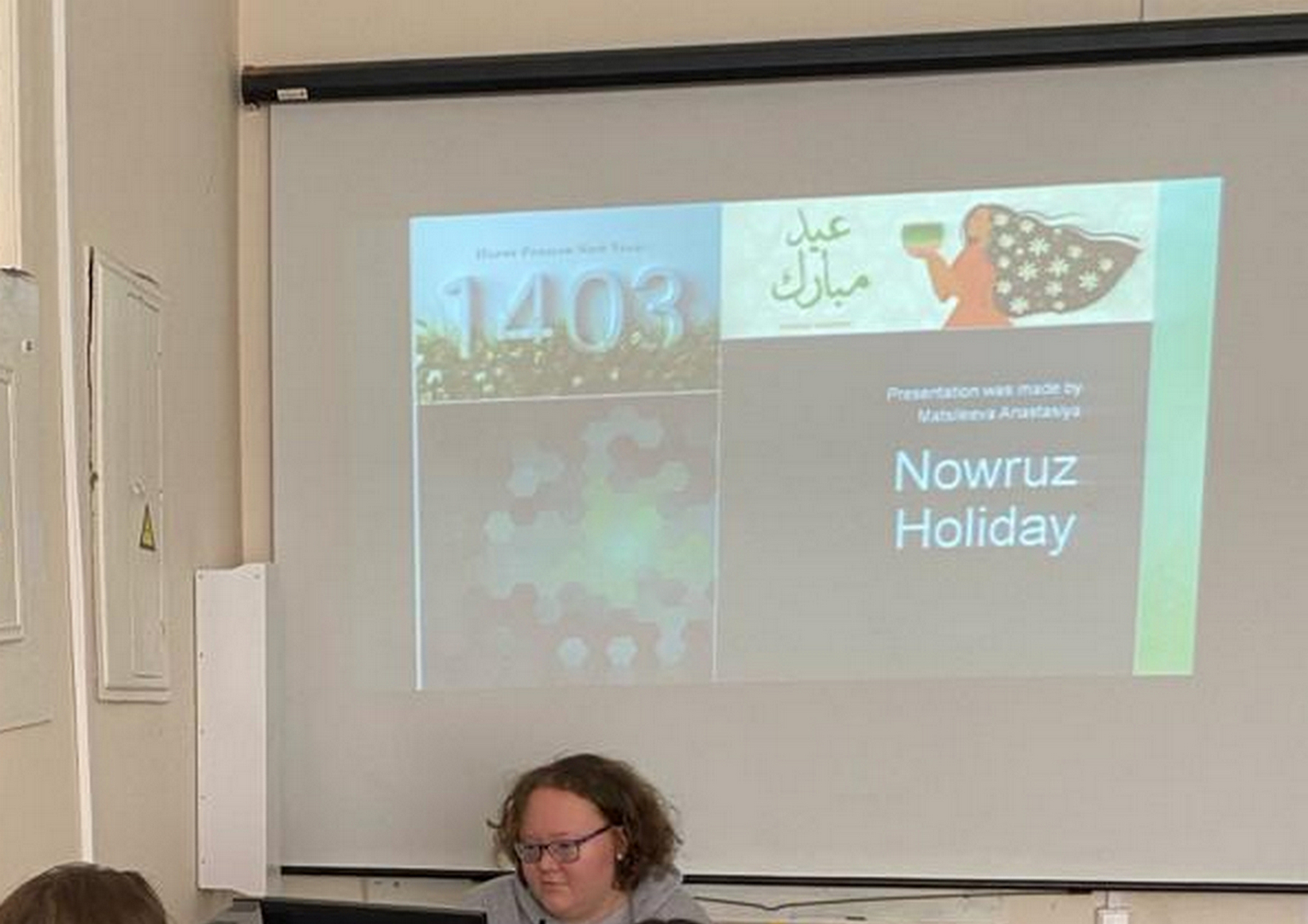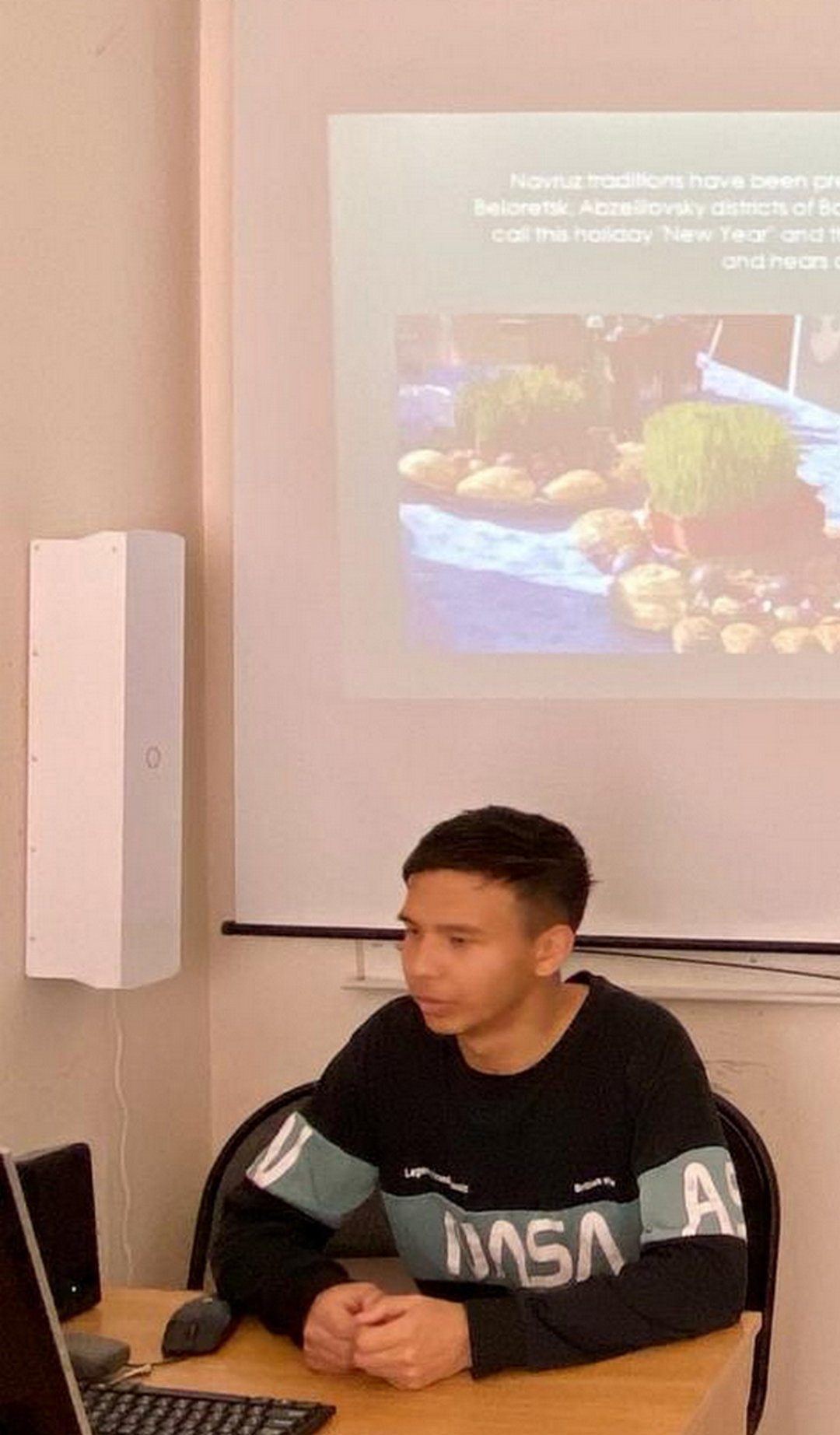 В мероприятии кафедры иностранных языков в дистанционном формате приняли участие и студенты Республики Казахстан. Например, Айым Тактарбекова (рук.: Серик Кульпеисов, Костанайский социально-технический университет им. академика З. Алдамжар) подготовила информативную и красочную презентацию, раскрывающую особенности празднования Навруза в Средней Азии.