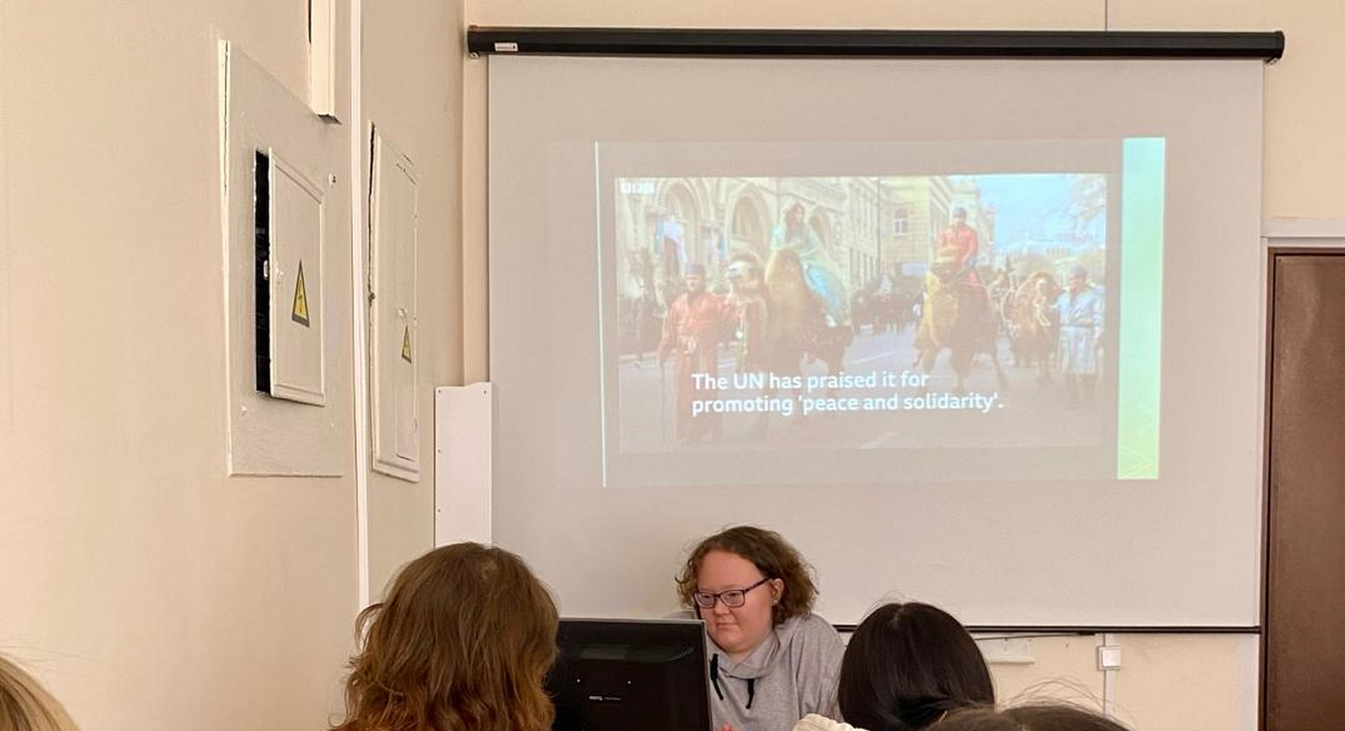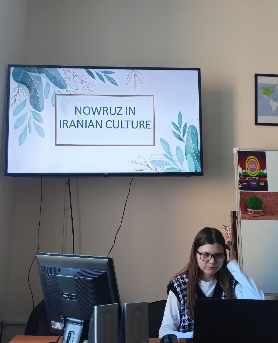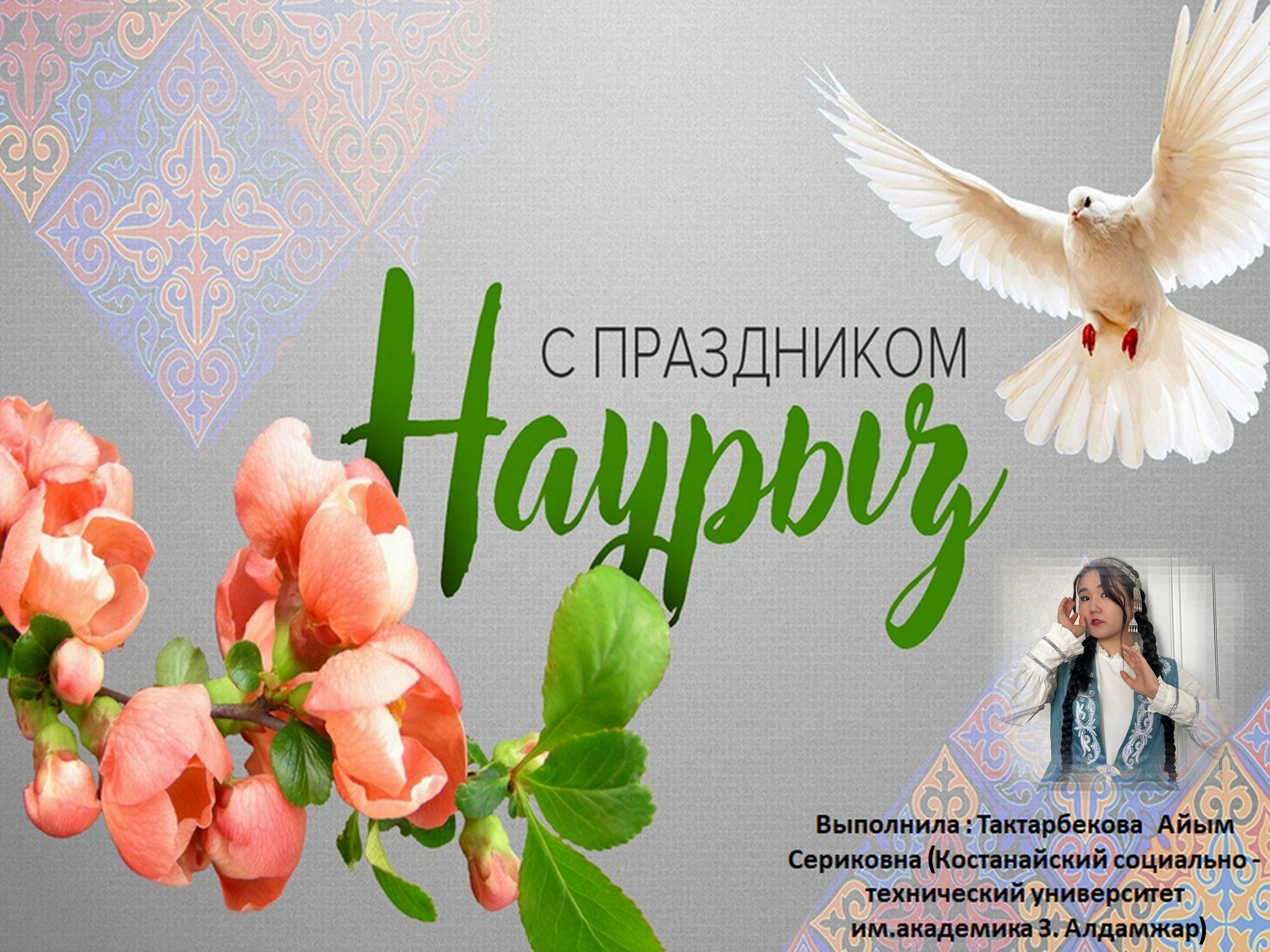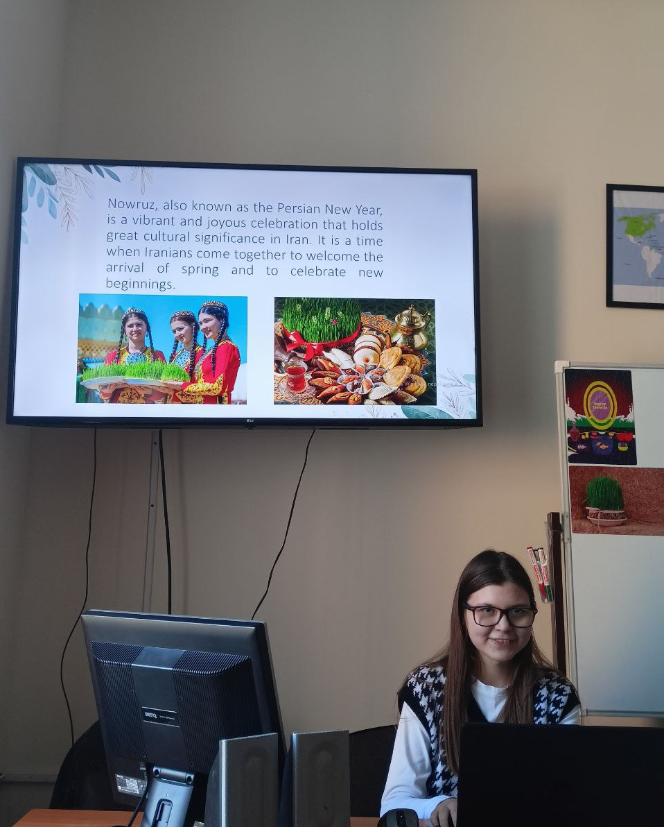 В мероприятии кафедры иностранных языков в дистанционном формате приняли участие и студенты Республики Казахстан. Например, Айым Тактарбекова (рук.: Серик Кульпеисов, Костанайский социально-технический университет им. академика З. Алдамжар) подготовила информативную и красочную презентацию, раскрывающую особенности празднования Навруза в Средней Азии.