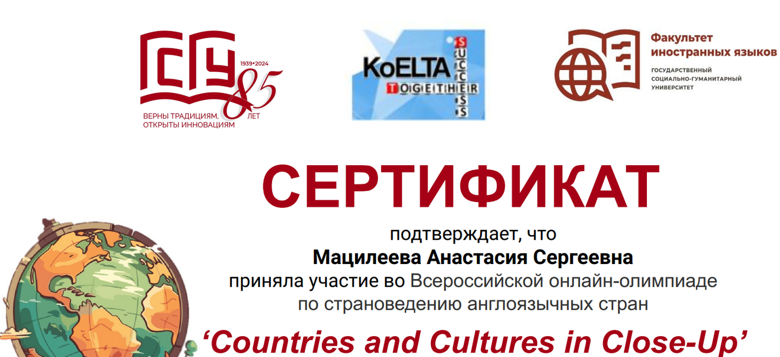 По получении подтверждающих документов представилось возможным опубликовать итоги Всероссийской онлайн-олимпиады по страноведению англоязычных стран ‘Countries and Cultures in Close-Up’, проведенной факультетом иностранных языков государственного образовательного учреждения высшего образования Московской области «Государственный социально-гуманитарный университет» (г. Коломна). В олимпиаде приняли участие студенты неязыковых специальностей Акмуллинского университета, среди которых хотелось бы выделить А. Мацилееву (рук.: Д.Р. Фатхулова).