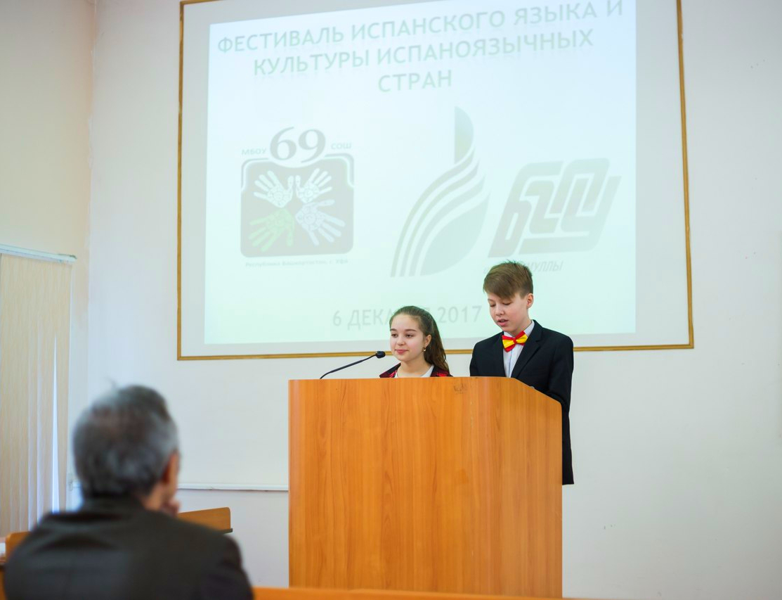 Центр образования № 69 г. Уфа совместно с кафедрой иностранных языков и институтом филологического образования и межкультурных коммуникаций 6 декабря 2017 года организовал «Фестиваль испанского языка и культуры испаноязычных стран». Мероприятие проходило на базе БГПУ им. М. Акмуллы и было посвящено студентам, которым на следующий год предстоит сделать выбор в изучении второго иностранного языка. Учащиеся Центра образования № 69 предложили студентам основательно задуматься над этим вопросом уже сейчас.