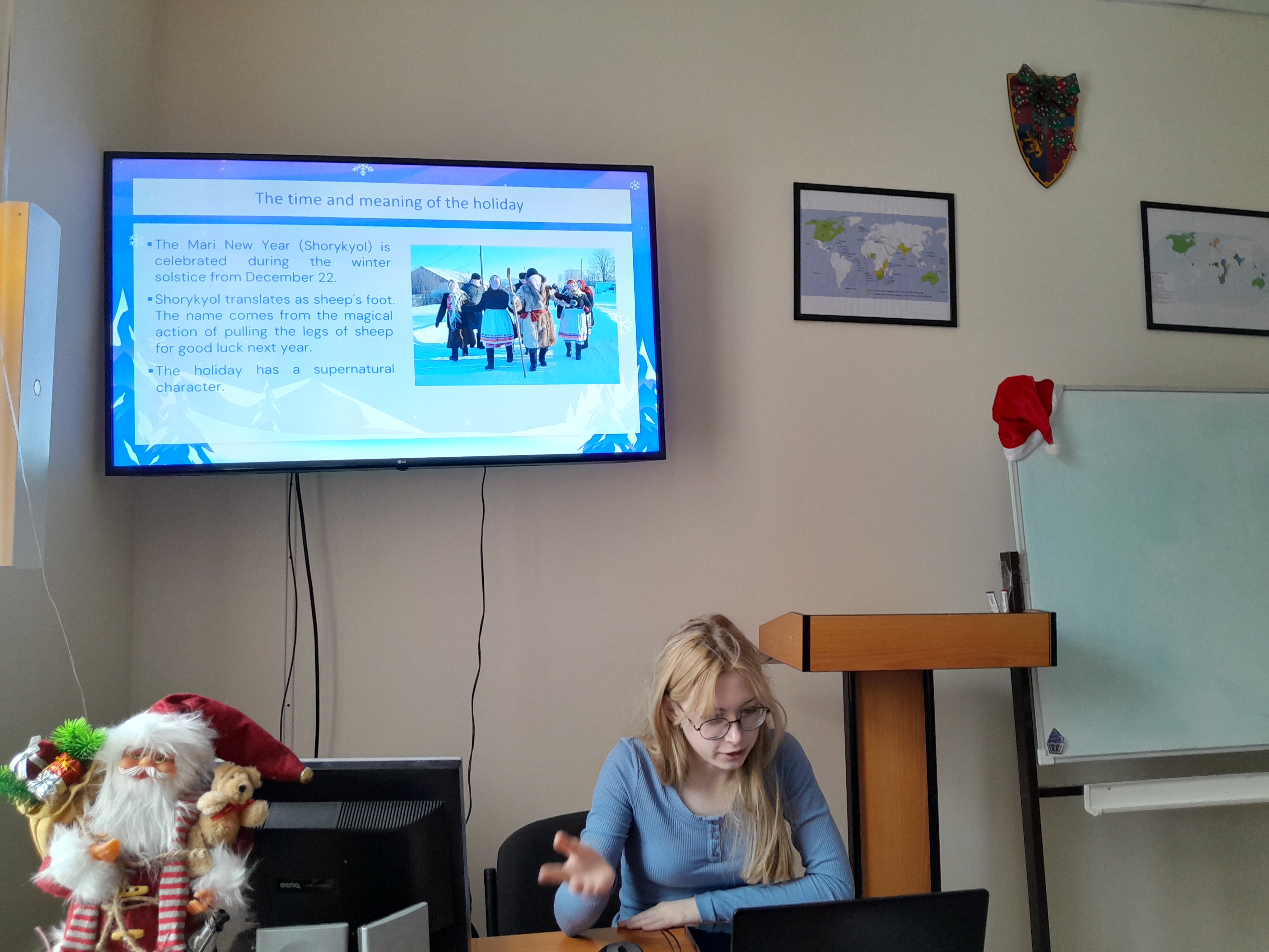 На 17-ой учебной неделе преподавателями кафедры иностранных языков (Д. Р. Фатхулова, А. И. Шагапов) было организовано и проведено мероприятие «Английское Рождество, Нардуган, Шорыкйол и другие зимние праздники народов мира: традиции, обычаи, мифологические персонажи». В докладах студентов на английском языке с позиций междисциплинарного подхода были проанализированы особенности традиционных зимних праздников в современном мире (страны Европы, Китай, Корея, Япония, Таиланд, Турция, Нигерия, Бразилия и др.). Была также рассмотрена история появления некоторых зимних персонажей, таких как, например, Йоулупукки (фин. Joulupukki «Дед на козле»). В сравнительно-сопоставительном аспекте была проанализирована специфика образов рождественских дарителей (“Christmas gift-givers”), которые встречаются в фольклорном наследии разных народов мира. Отдельное внимание было уделено выступлениям на английском языке, посвященным зимним праздникам народов Российской Федерации, таким как, например, тюркский Нардуган, марийский Шорыкйол и чувашский Сурхури. Мероприятие, несомненно, способствовало расширению знаний студентов в рамках предметных областей страноведения и лингвокультурологии и содействовало развитию языковой и межкультурной компетенций.