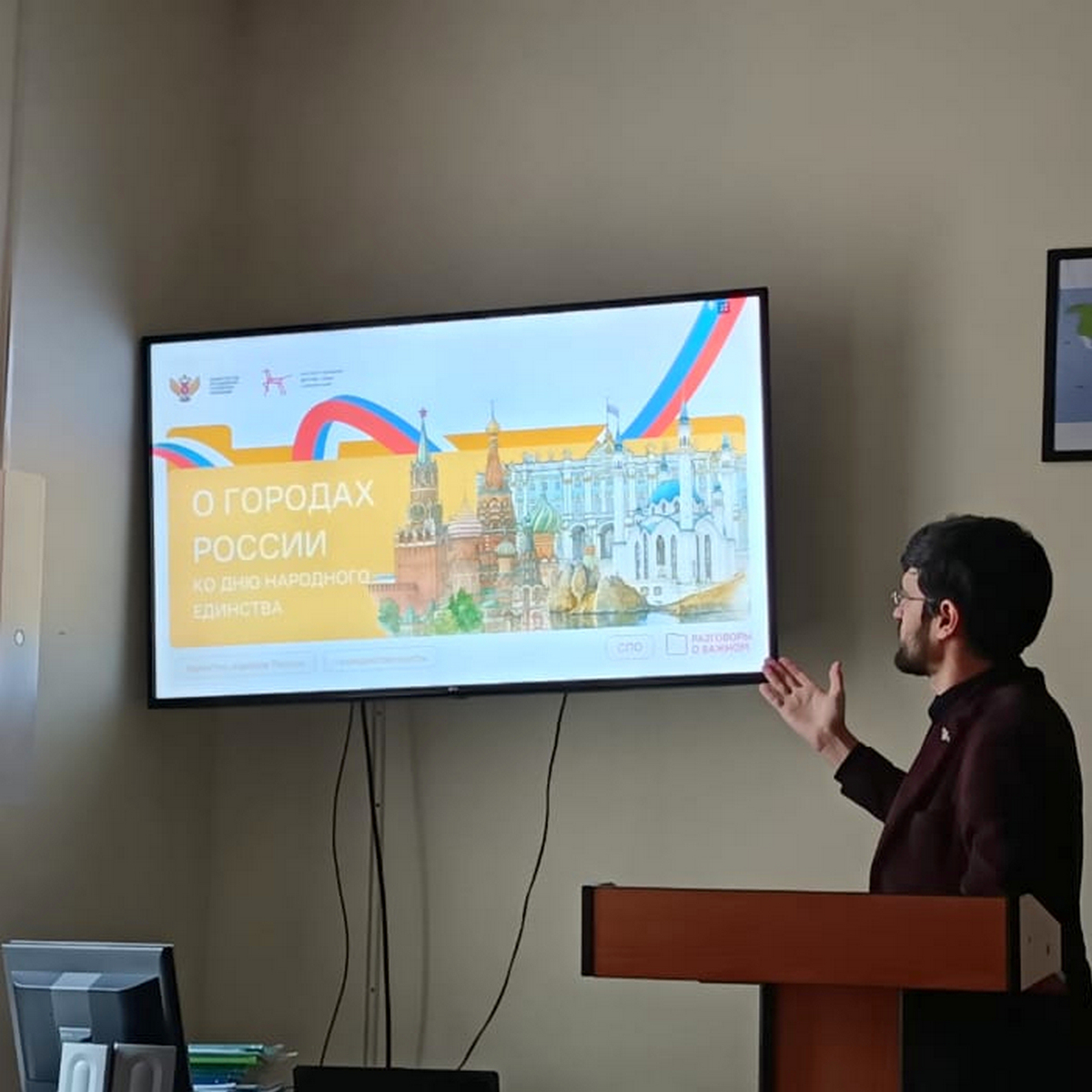 В преддверии Дня народного единства преподаватели кафедры иностранных языков С. М. Хантимиров и А. И. Шагапов провели серию тематических встреч на разных факультетах. Студенты узнали много нового об истории городов России и их экономическом потенциале, о происхождении названий городов нашей страны и их героическом прошлом. Также студенты ознакомились с творчеством Татьяны Куртуковой, известной исполнительницы патриотических произведений, в том числе песни «Матушка-земля». После просмотра интервью всем запомнились интересные факты, связанные с гастролями Куртуковой по городам России.