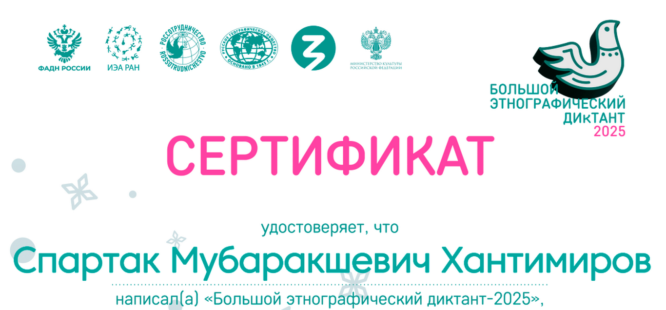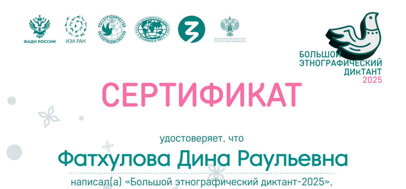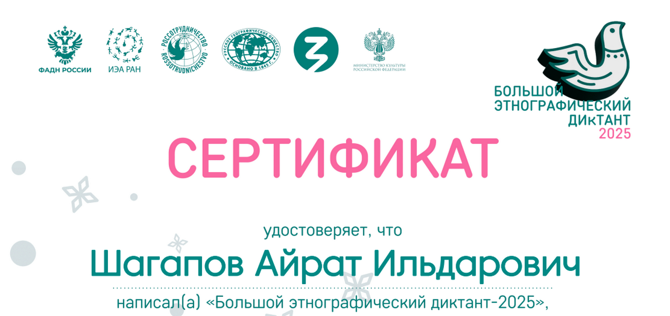 С 1 по 8 ноября 2025 года преподаватели кафедры иностранных языков И. А. Вахитова, О. Е. Кулешова, Р. И. Сафарова, Д. Р. Фатхулова, С. М. Хантимиров, А. И. Шагапов, В. Д. Швайко приняли участие в Юбилейной X Всероссийской просветительской акции «Большой этнографический диктант».