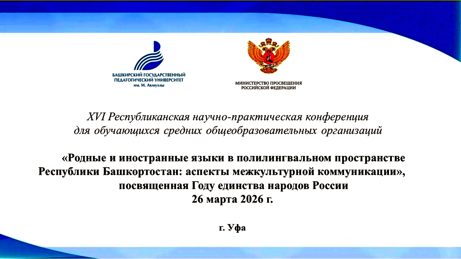 26 марта в стенах Акмуллинского университета состоялась XVI Республиканская научно-практическая конференция для учащихся средних общеобразовательных организаций «Родные и иностранные языки в полилингвальном пространстве Республики Башкортостан: аспекты межкультурной коммуникации». Старший преподаватель кафедры иностранных языков О. Е. Кулешова выступила руководителем секции «Язык как зеркало национальной культуры: традиции и современность».