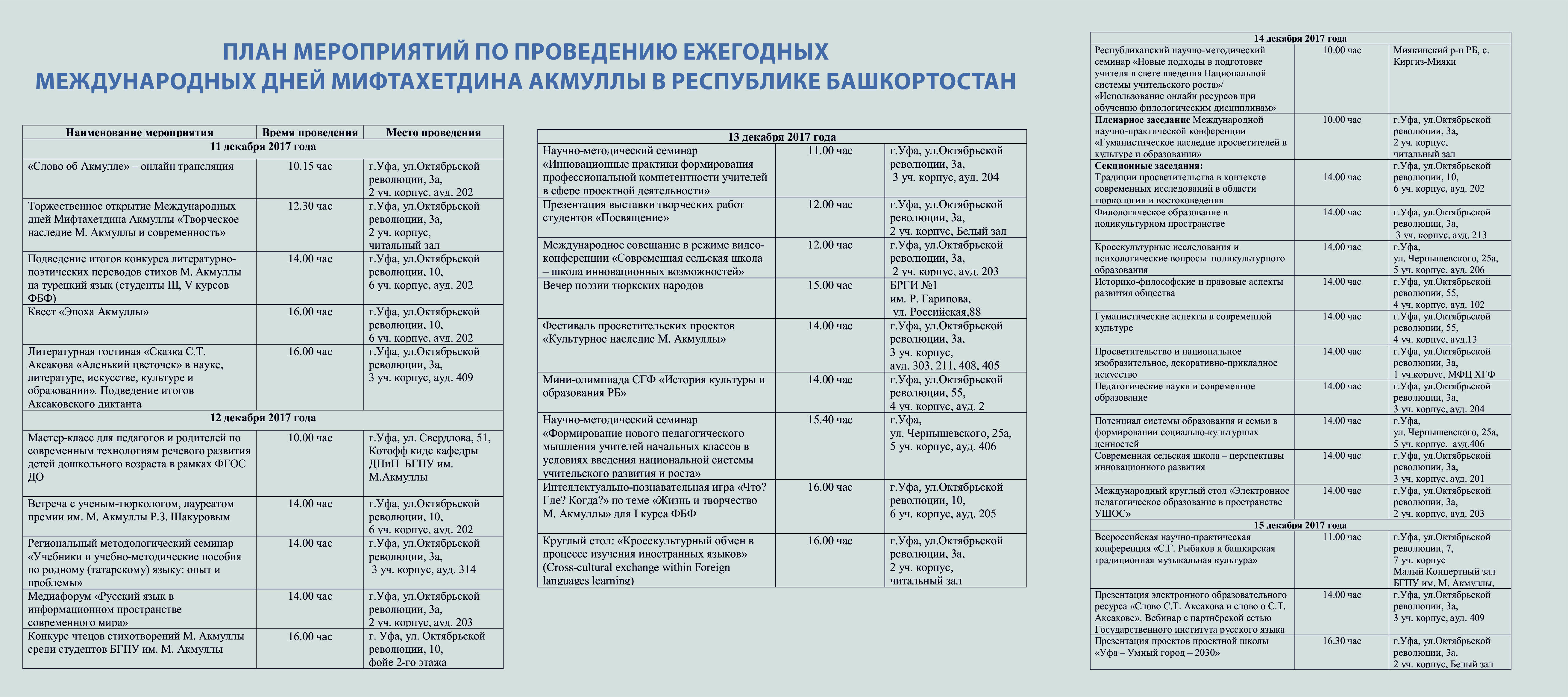 С 11 по 15 декабря 2017 года в стенах Башкирского государственного педагогического университета им. М. Акмуллы пройдут традиционные Международные Дни Мифтахетдина Акмуллы.