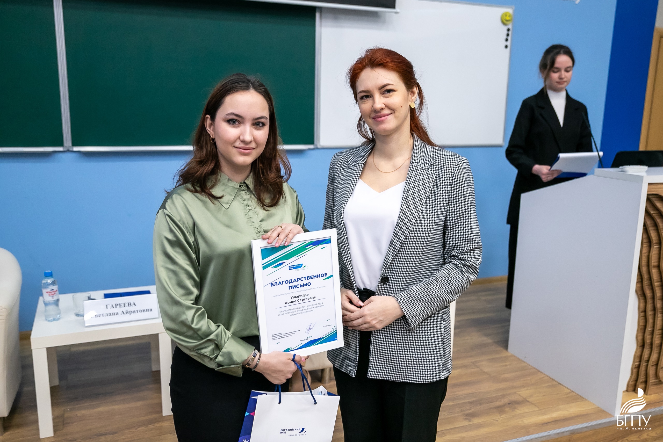 Награды получили председатель Студенческого научного общества БГПУ им.М.Акмуллы Арина Ушаридзе, и.о. начальника отдела научной работы Наталья Халитова и научный сотрудник научно-исследовательской лаборатории «Методология и методы гуманитарных исследований» Николай Щербаков.