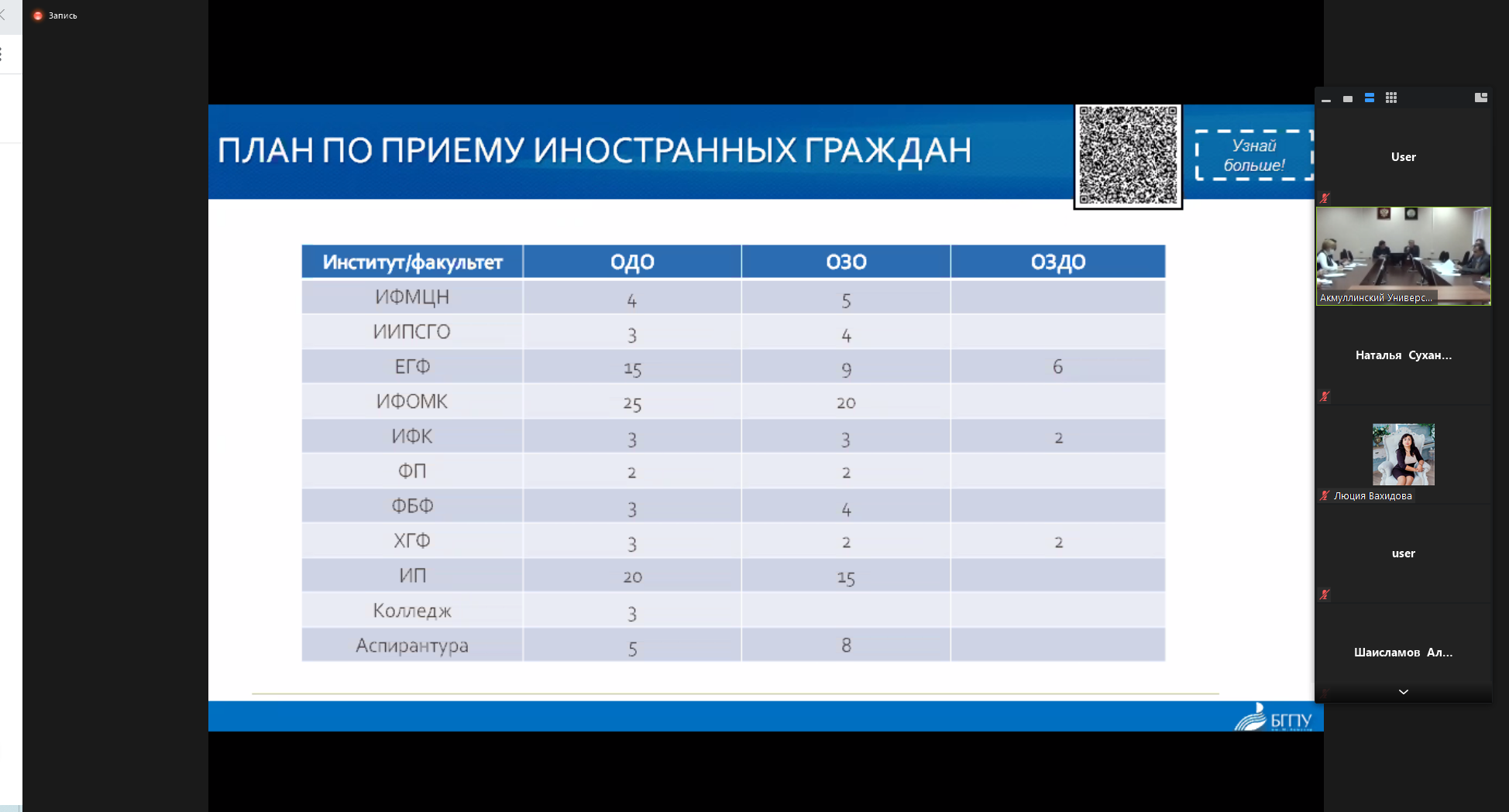 — запланирован комплекс дистанционных мероприятий с иностранными вузами-партнерами по разъяснению порядка прохождения процедуры регистрации иностранных граждан, желающих поступить в Акмуллинский университет.