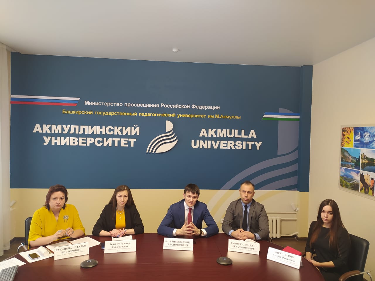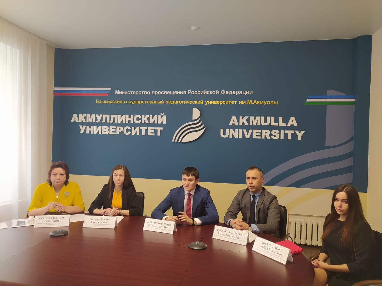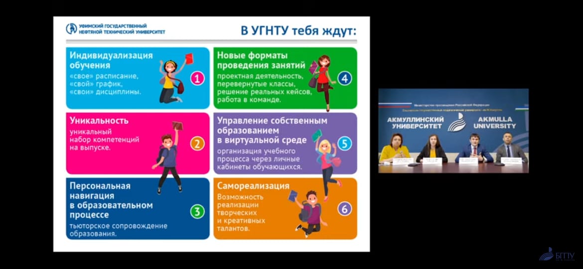 Во встрече приняли участие заместитель ответственного секретаря Приемной комиссии БГПУ им.М.Акмуллы Зульфия Зиннурова, ведущий специалист международных связей БГПУ Альфия Бисенгулова, проректор по организации приёма студентов и профориентационной деятельности УГНТУ Денис Каретников, начальник отдела внеучебной и визово-регистрационной работы управления международного сотрудничества УГНТУ Салимджон Урунов,  . Модератором выступила проректор по научной деятельности Акмуллинского университета Наталья Суханова.