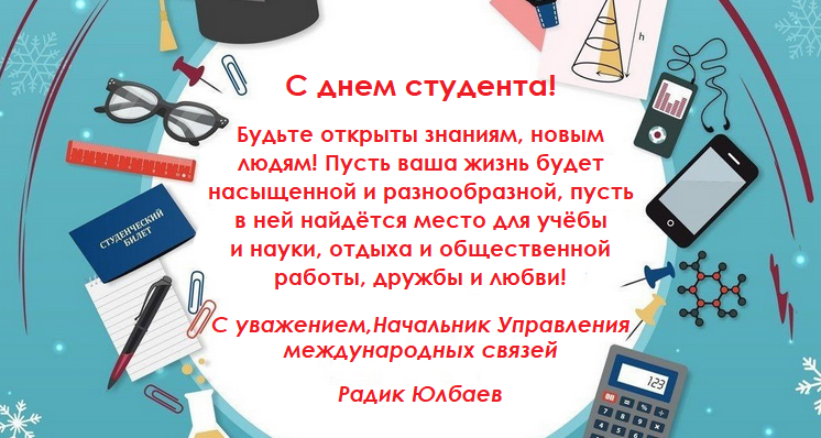 Управление международных связей поздравляет всех учащихся, сотрудников и преподавателей Акмуллинского с Днем студента и желает успехов