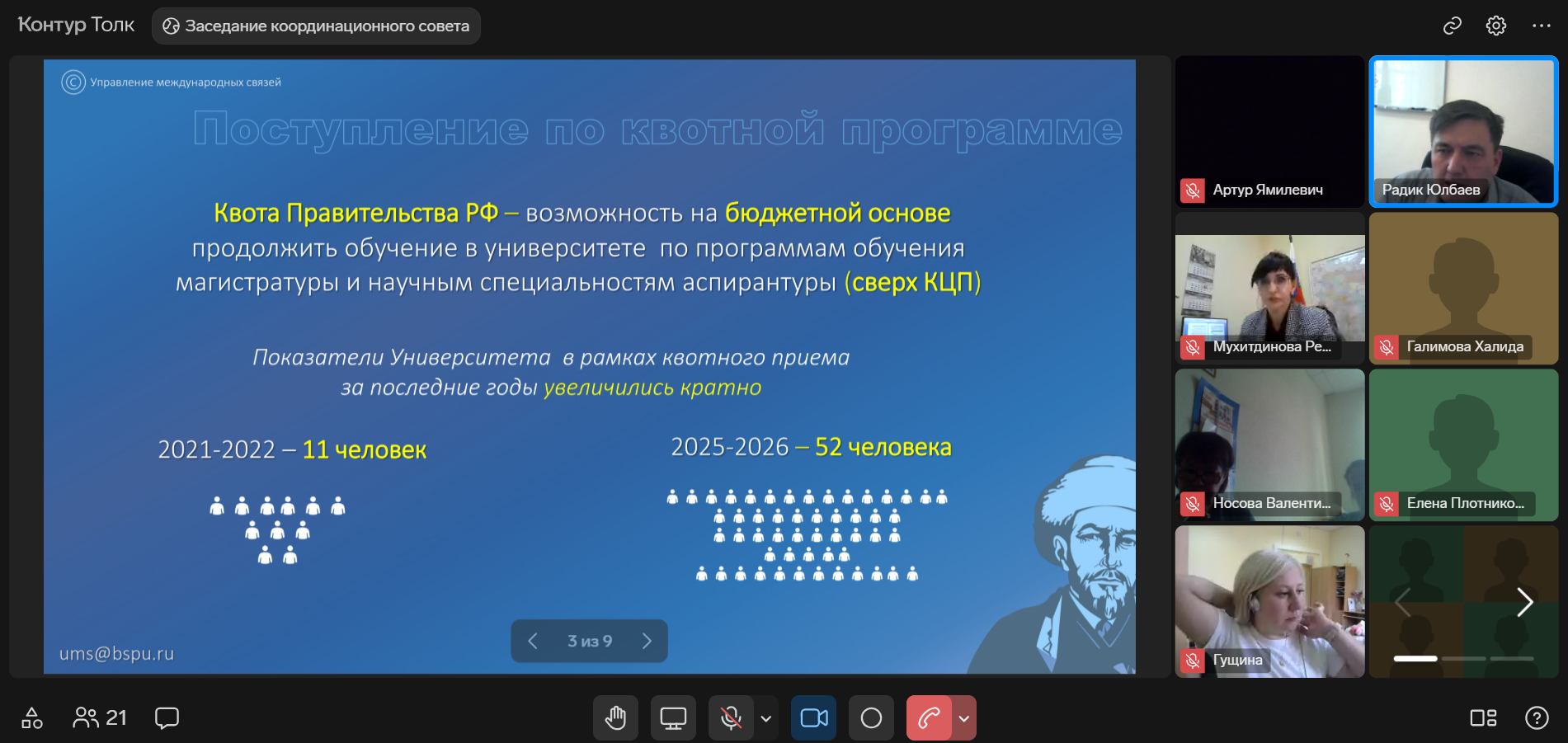 Повестка собрания была посвящена актуальным вопросам. В своем выступлении Радик Юлбаев рассказал о поступлении в 2026 году кандидатов из числа выпускников БГПУ им. М.Акмуллы  и иностранных университетов на обучение в БГПУ им. М.Акмуллы в рамках квоты Правительства РФ, деталях регистрации на портале https://education-in-russia.com/ и сроках подачи документов, призвав ответственных лиц от факультетов провести работу с обучающимися выпускных курсов.