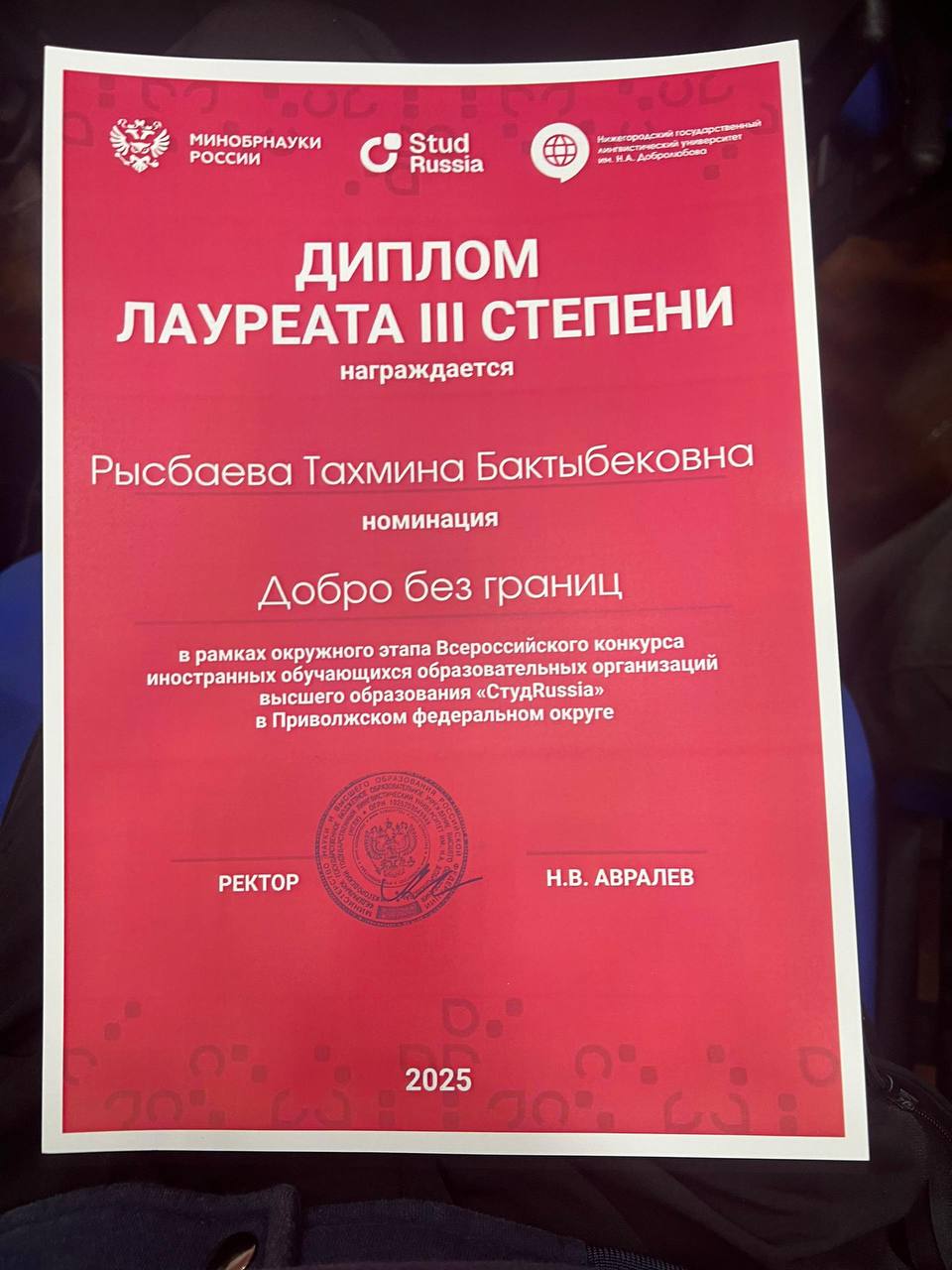 • Рысбаева Тахмина получила звание лауреата 3 степени в номинации «Добро без границ»;