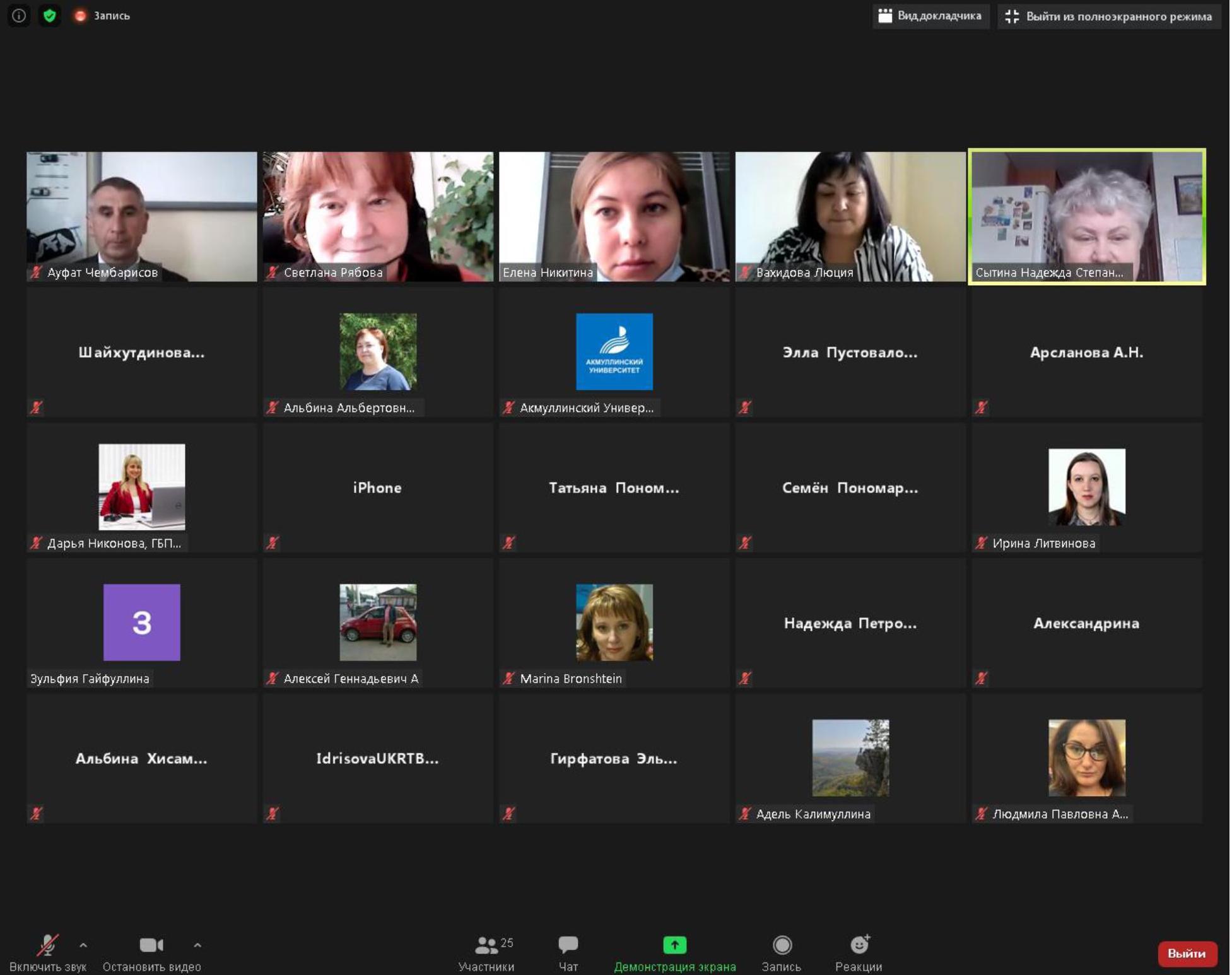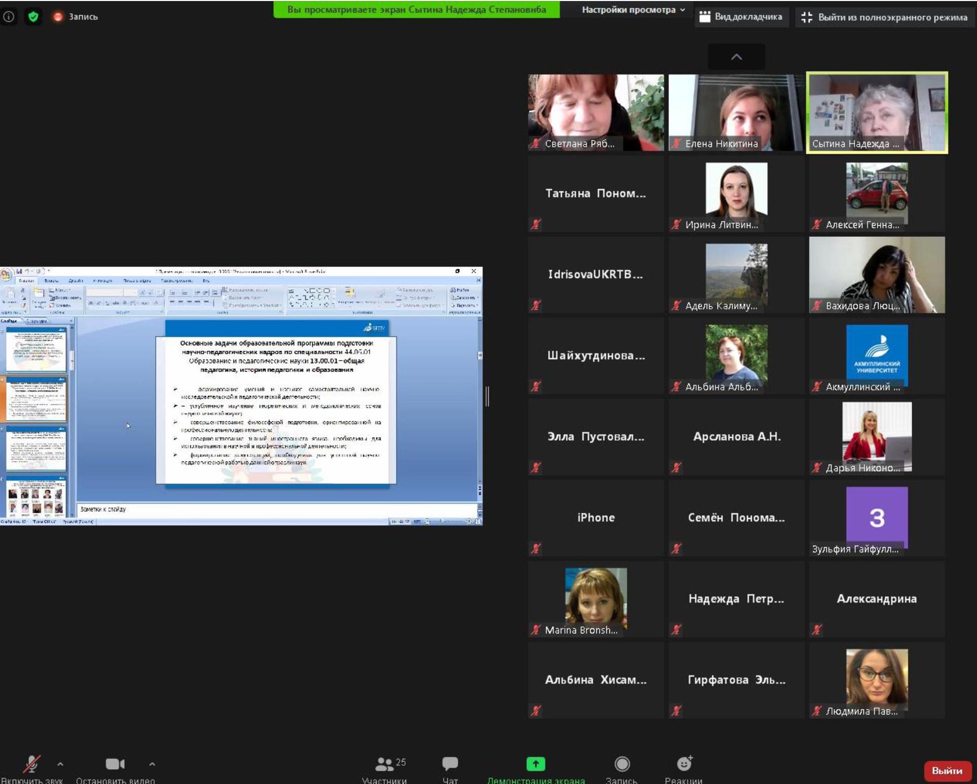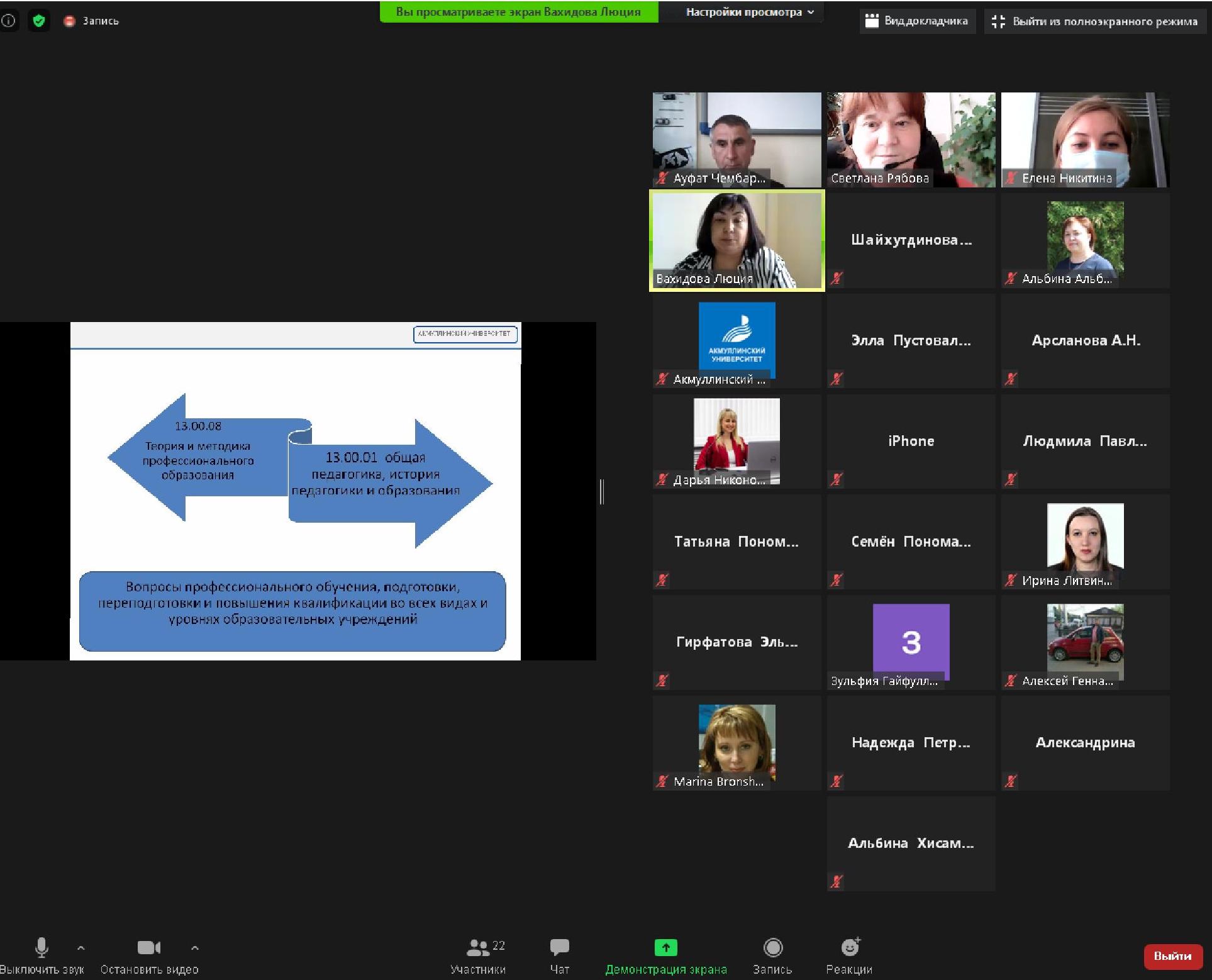 27 апреля прошла онлайн презентация образовательных программ аспирантуры для преподавателей колледжей Республики Башкортостан. Перед участниками выступили Сытина Надежда Степановна , заведующая кафедрой педагогики, Вахидова Люция Вансеттовна,  заведующая кафедрой профессионального и социального образования, заведующая аспирантурой Рябова Светлана Владимировна.