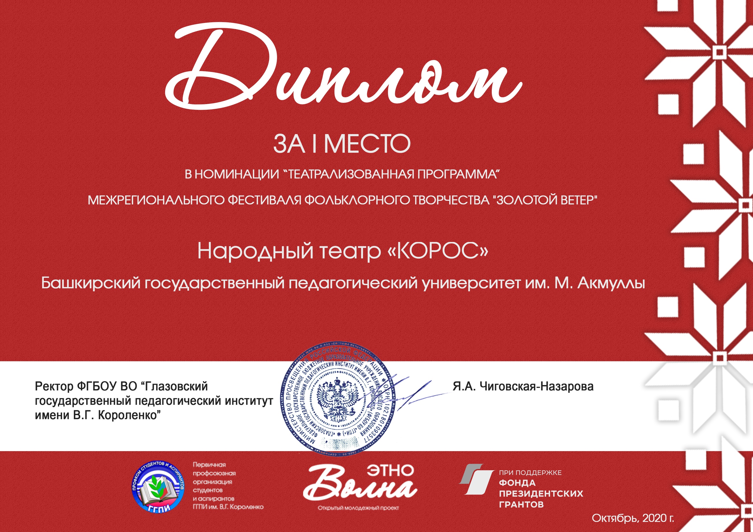 29-30 октября 2020 года в Глазовском государственном педагогическом институте имени В.Г. Короленко (г. Глазов, Удмуртская Республика) состоялся Межрегиональный фестиваль фольклорного творчества «Зарни тöл» («Золотой ветер»).