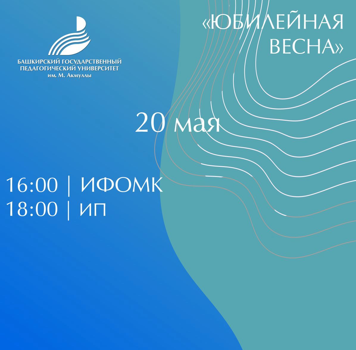 С 16 по 20 мая в БГПУ им. М. Акмуллы пройдет фестиваль «Юбилейная Весна». Факультеты, институты и Колледж Акмуллинского университета представят зрителям выступления по четырем направлениям: музыкальное искусство, театральное искусство, оригинальный жанр и хореография. Главная тематика номеров фестиваля - 55-летие БГПУ им. М. Акмуллы.