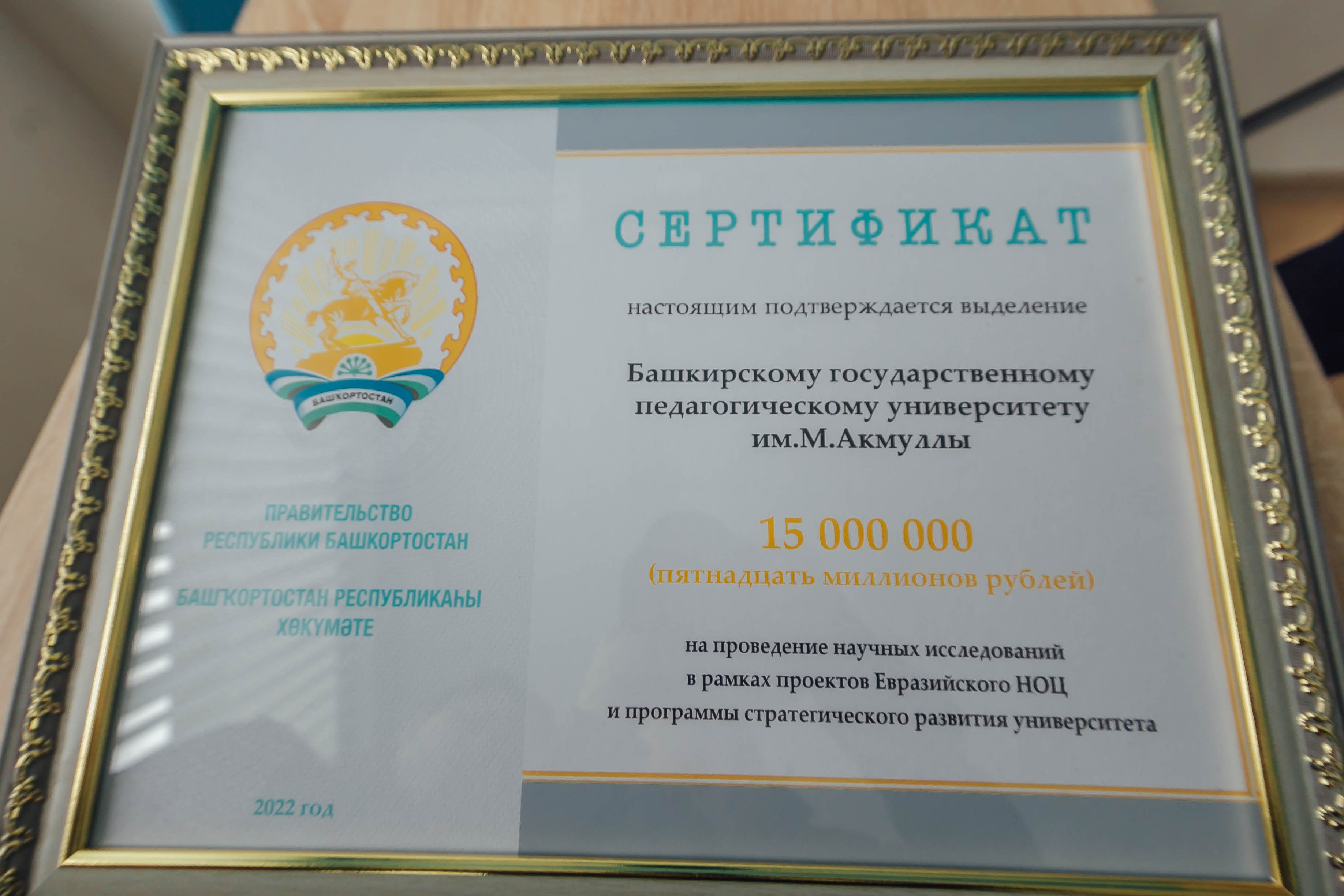 Первый заместитель Премьер-министра Правительства Башкортостана поздравил студентов и руководство университета с праздником и вручил ректору вуза сертификат от Правительства региона на 15 млн рублей. Эти деньги будут направлены на реализацию в вузе научных программ Евразийского НОЦ и стратегическое развитие университета. Такую поддержку вузам региона в январе 2022 года анонсировал Глава Башкортостана Радий Хабиров, поздравляя Башгоспедуниверситет с 55-летним юбилеем.