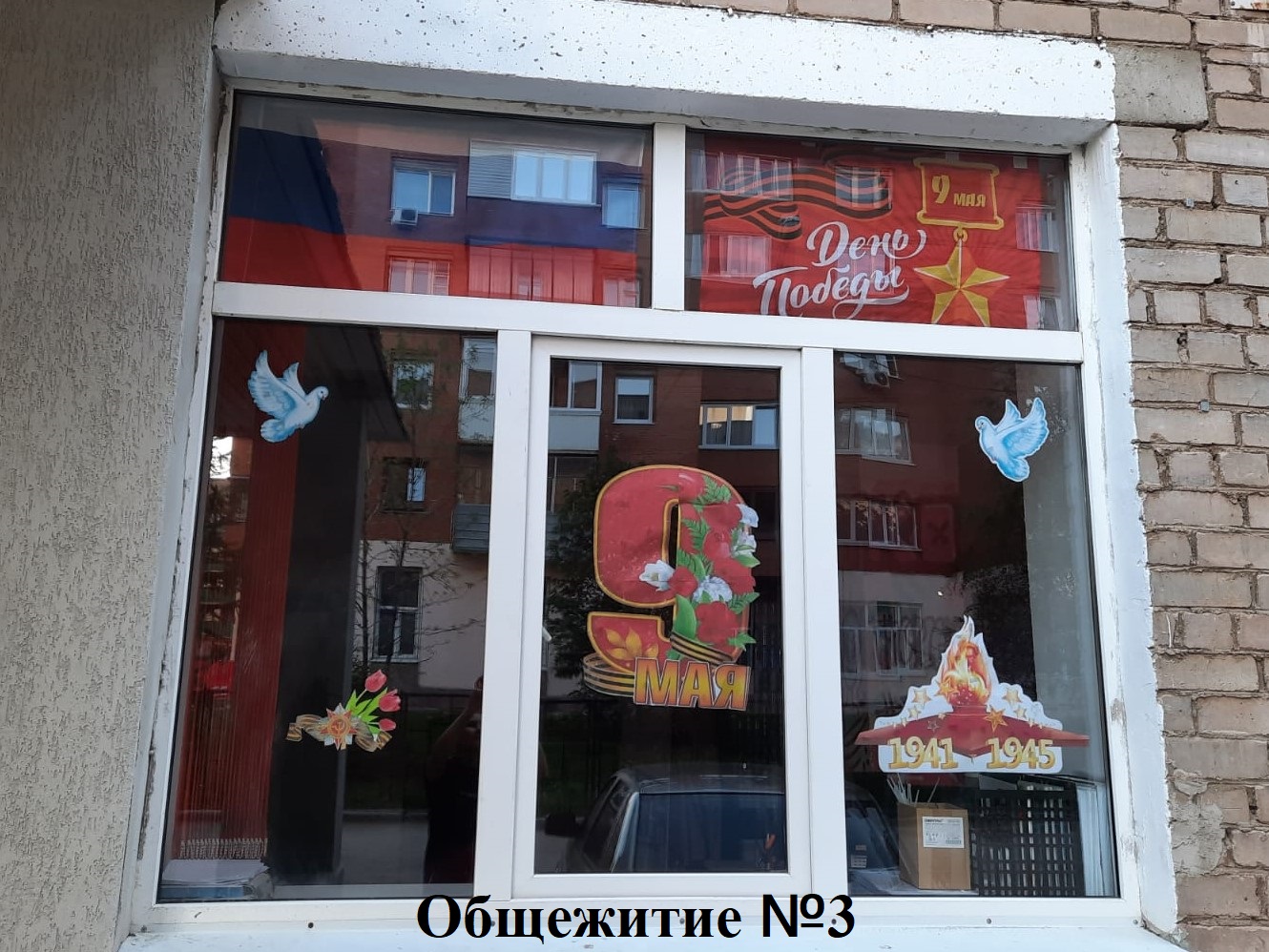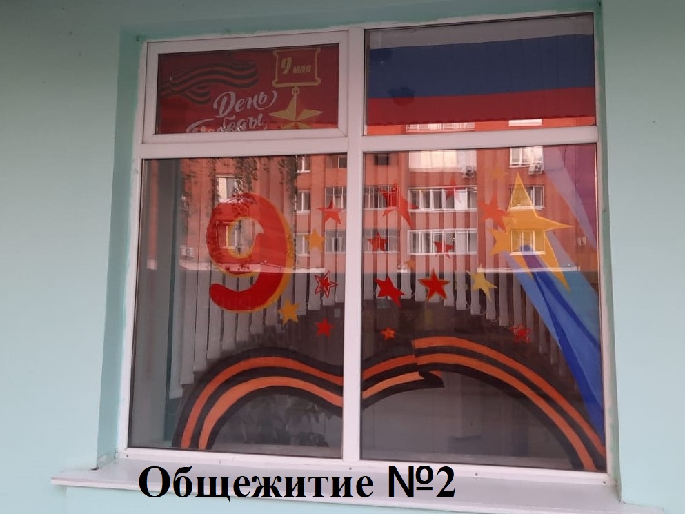 Студенты украсили окна семи общежитий государственными флагами, рисунками, картинками и надписями, посвященными Великой Победе наших дедов.