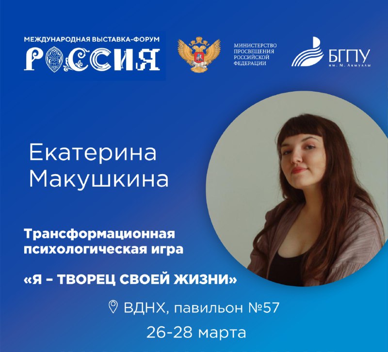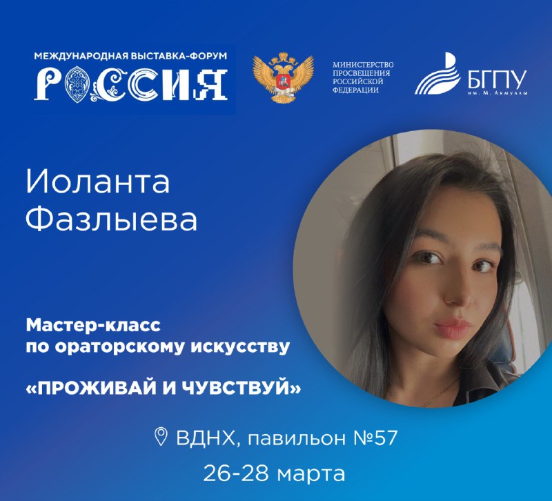 С 26 по 28 марта БГПУ имени М. Акмуллы организует свою программу в павильоне №57 (Исторический парк «Россия – Моя история») на ВДНХ. В течение трех дней преподаватели и студенты проведут ряд мастер-классов и лекций для посетителей экспозиции Минпросвещения России.
