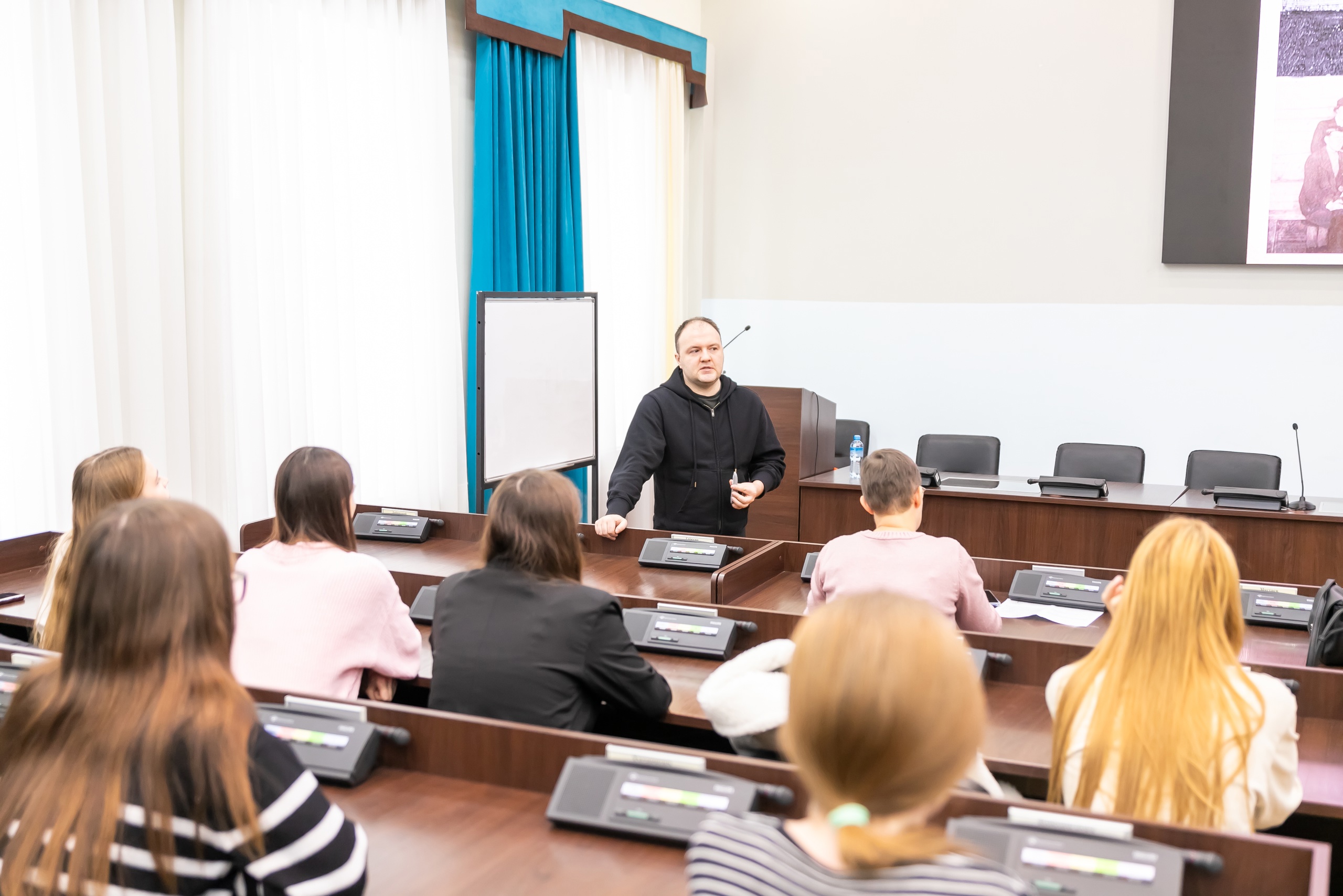 На встречу со студентами пришли Алексей Стецюк, председатель ТРООРГО «Активный гражданин» и Николай Каташов, режиссёр фильмов проекта «Истории забытых деревень».