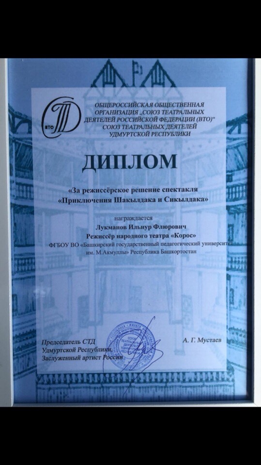 - диплом от ООО «Союз театральных деятелей РФ» СТД Удмуртской Республики режиссеру спектакля и руководителю коллектива И.Ф. Лукманову в номинации «За режиссерское решение спектакля».