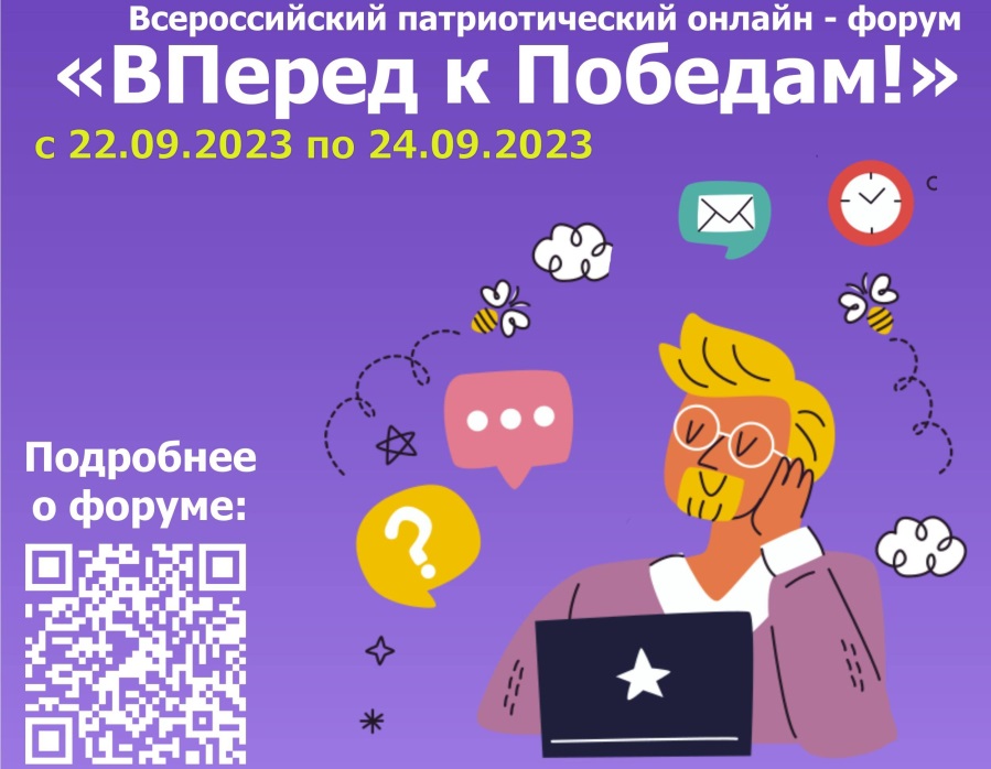 22 по 24 сентября 2023 года на платформе состоится Всероссийский патриотический онлайн-форум «Вперед к Победам» (онлайн). Зарегистрироваться на него можно до 20 сентября 2023 года.