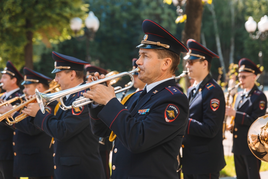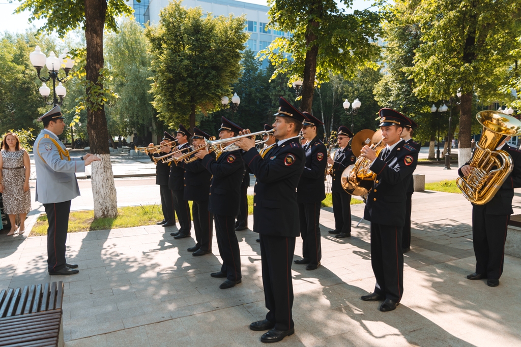Поднятие флагов прошло при участии оркестра Культурного центра Министерства внутренних дел по Республике Башкортостан под руководством дирижёра Артура Салямова, который исполнил гимны Российской Федерации и Республики Башкортостан.