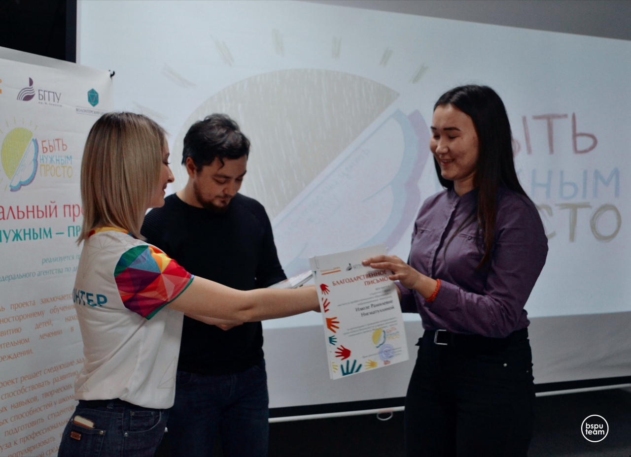 Благодаря реализации проекта «Быть нужным – просто» у школьников, проходящих лечение в больнице, появилась возможность получать от специально подготовленных добровольцев Волонтерского центра БГПУ им. М. Акмуллы полезную информацию по школьным предметам в рамках дополнительных учебных занятий, обучаться на тематических мастер-классах, расширять знания в области образования, науки, искусства.