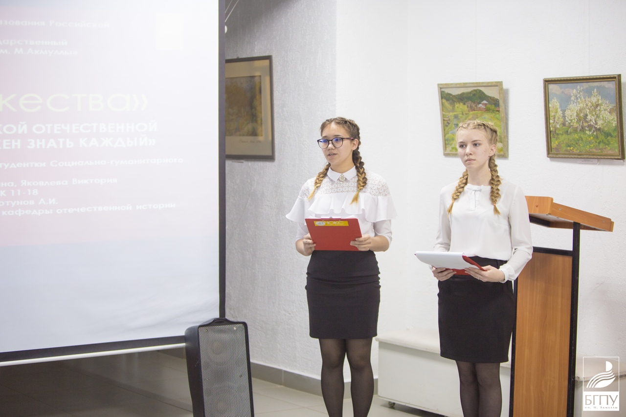 17 мая 2019 года в БГПУ им. М. Акмуллы традиционно состоялся очный этап общеуниверситетского студенческого конкурса на лучшую презентацию «Урока мужества» для учащихся общеобразовательных организаций г. Уфы и Республики Башкортостан. Организаторами конкурса выступили: Научно-методический центр патриотического воспитания молодежи Республики Башкортостан, Институт исторического и правового образования БГПУ им. М. Акмуллы, управление по воспитательной работе и молодежной политике вуза и мультимедийный исторический парк "Россия – моя история".