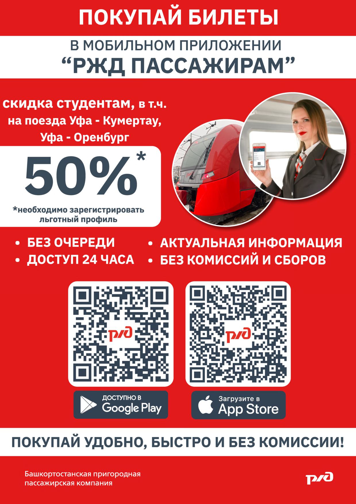 С 1 сентября по 15 июня для студентов дневных отделений колледжей и вузов в Башкортостане действует скидка 50% на оплату проезда в пригородных поездах. Льготные билеты можно оформить в железнодорожной кассе или мобильном приложении «РЖД Пассажирам».