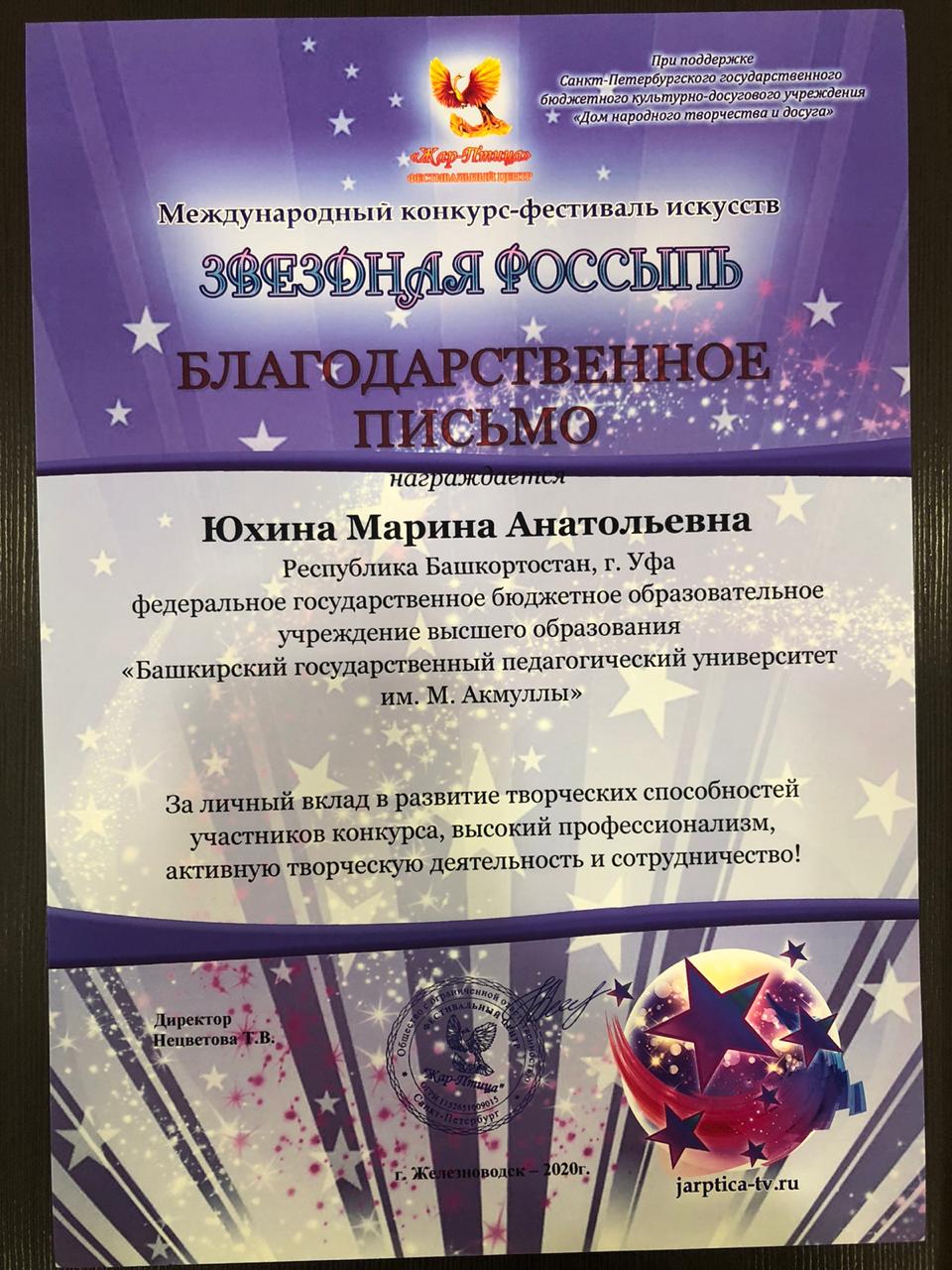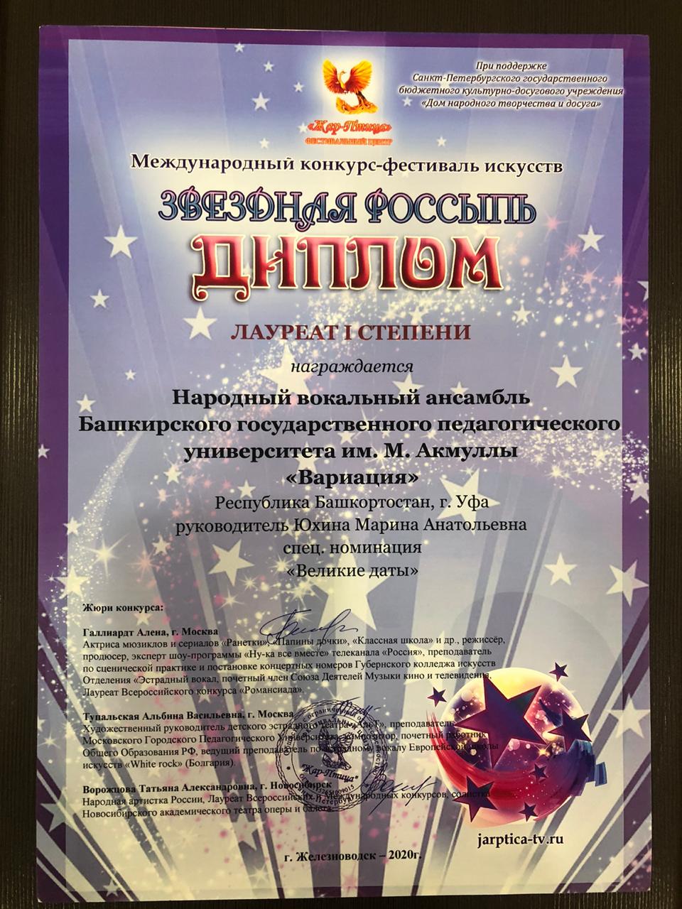 «Вариация» достойно представила честь БГПУ им. М. Акмуллы на фестивале и стала лауреатом I степени в номинациях «Эстрадный вокал» и «Великие даты». Руководителю коллектива Марине Юхиной вручили благодарственное письмо за личный вклад в развитие творческих способностей участников конкурса, высокий профессионализм, активную творческую деятельность и сотрудничество.