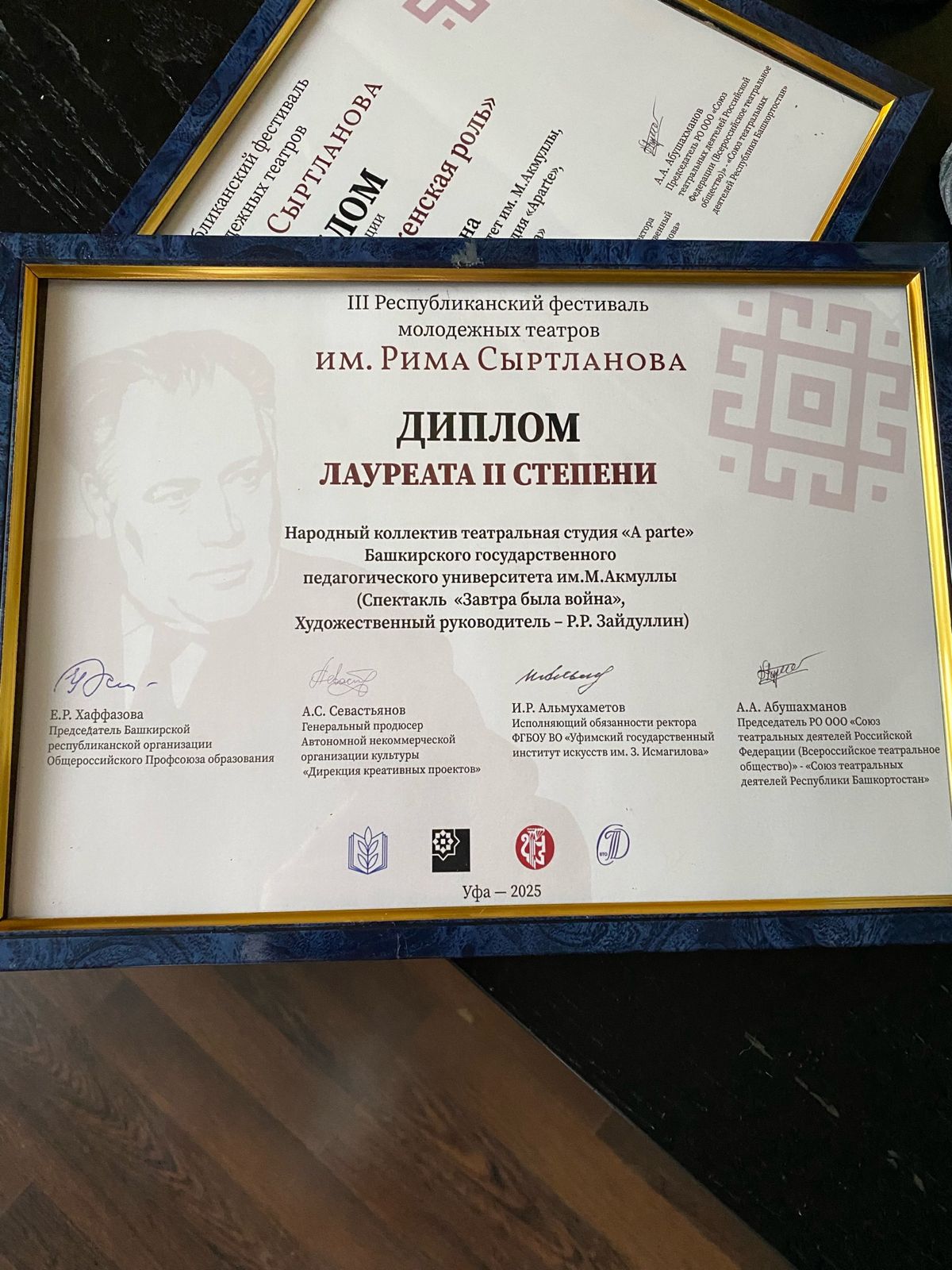 В Уфе подвели итоги III Республиканского фестиваля молодежных театров имени Рима Сыртланова. Двухмесячный марафон включал 12 спектаклей с участием 140 талантливых актёров, всего более семисот зрителей насладились мастерством наших студентов. На фестивале были представлены постановки в шести направлениях: драматический, пластический, музыкальный театры, театр кукол, театр теней и экспериментальный театр.