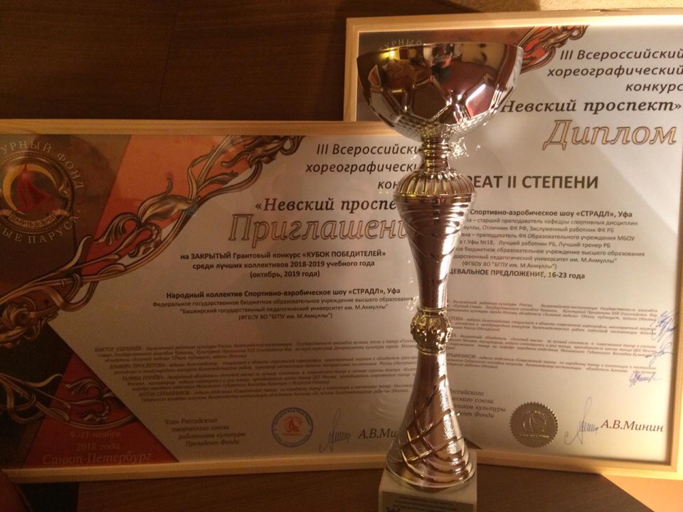 Народный коллектив - спортивно-аэробическое шоу "Страдл" БГПУ им. М. Акмуллы (рук. Заслуженный работник физической культуры и спорта РБ Римма Мухаметовна Имамова и Светлана Хадидовна Житкова) за своё творческое выступление был удостоен диплома лауреата II степени! Также коллектив получил приглашение на закрытый Грантовый конкурс "Кубок победителей" среди лучших коллективов 2018-2019 учебного года, который состоится в октября 2019 года.