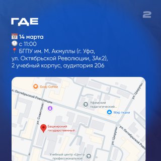 Место: БГПУ им. М. Акмуллы (г. Уфа, ул. Октябрьской Революции, 3Ак2), 2 учебный корпус, аудитория 206
