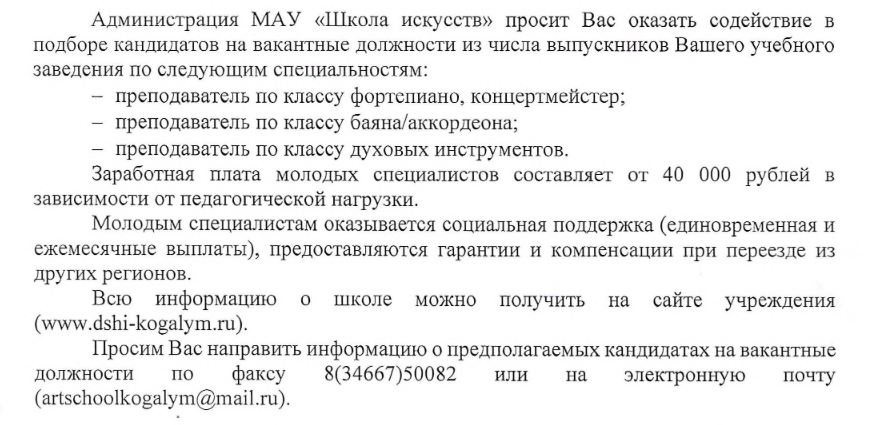 МАУ "Школа искусств" приглашает вас на работу на 2020/21 учебный год. Вакансии и контакты в прикрепленном документе