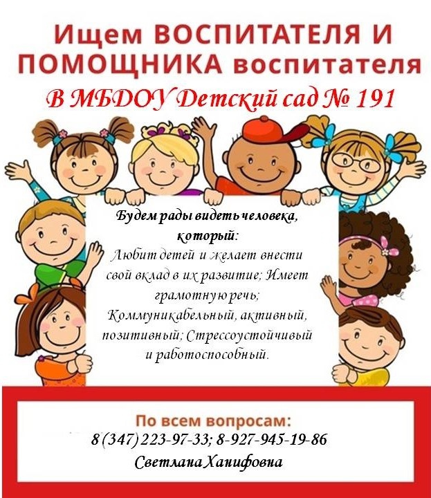 МБДОУ Детский сад №191 примет на работу воспитателя и помощника воспитателя