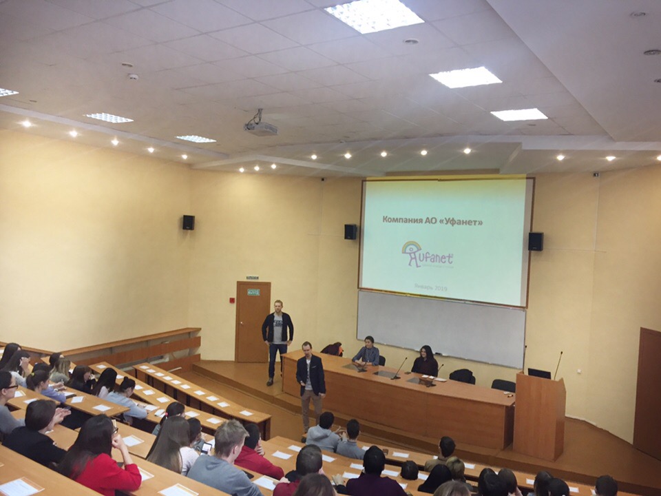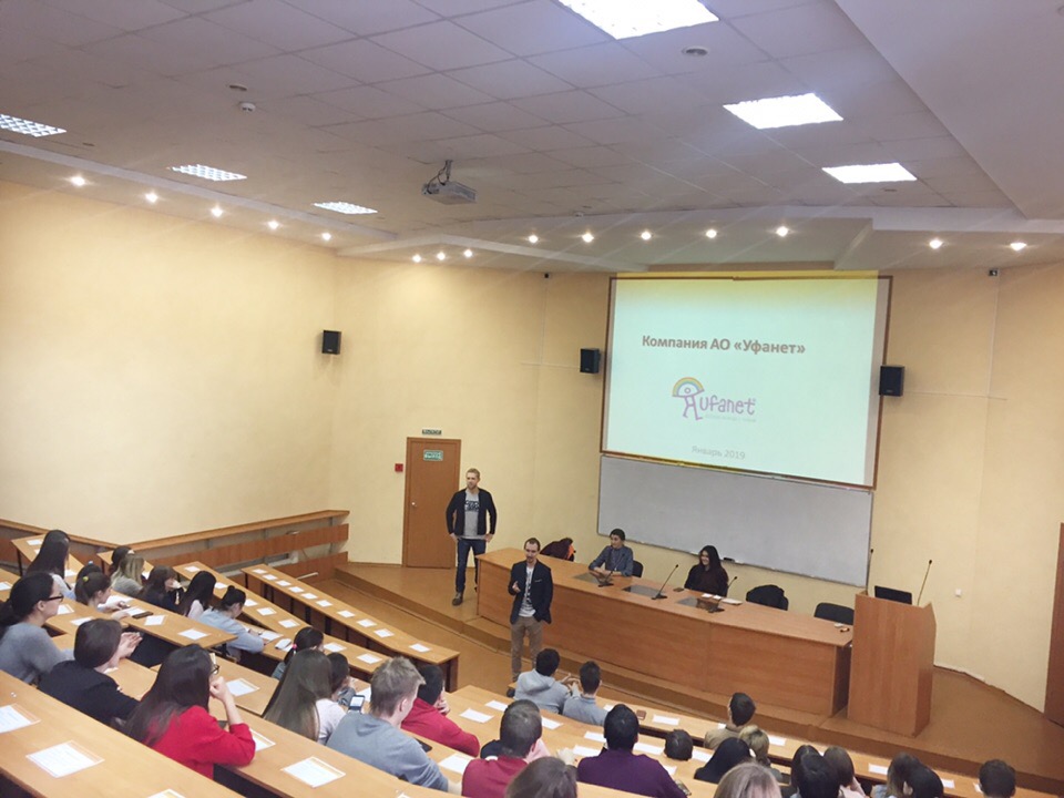 30 января состоялась встреча студентов физико-математического факультета и института профессионального образования и информационных технологий с компанией АО «Уфанет». На встречу к студентам пришли: руководитель службы поддержки клиентов - Дмитрий Шабаев, заместитель руководителя клиентских служб - Зарема Камильянова и представители кадровой службы.