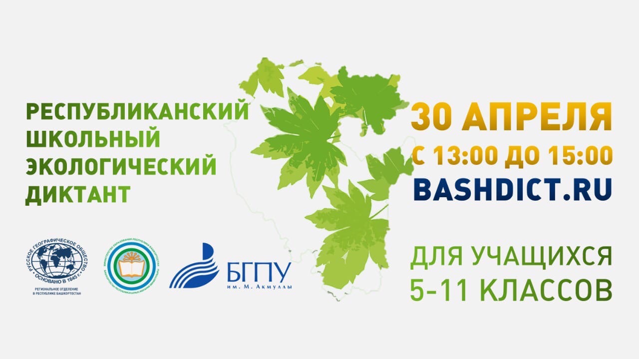 Министерство образования и науки Республики Башкортостан совместно с региональным отделением Русского географического общества в Республике Башкортостан проводит Республиканский школьный экологический диктант для учащихся 5-11 классов. Соучредителем акции выступает Башкирский государственный педагогический университет им.М.Акмуллы.