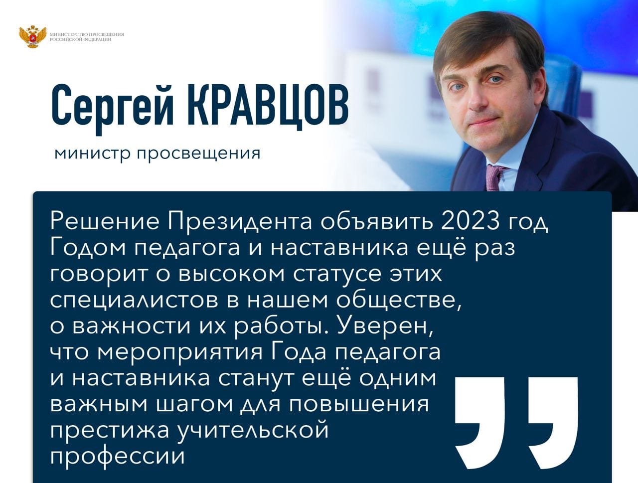 «Решение Президента объявить 2023 год Годом педагога и наставника еще раз говорит о высоком статусе этих специалистов в нашем обществе, о важности их работы. Мы видим, как растет популярность этой профессии, какие яркие и мотивированные абитуриенты приходят в педагогические вузы, с каким энтузиазмом работают, вливаются в учительскую когорту молодые специалисты, как поддерживают их опытные коллеги и наставники, как развиваются профессиональные конкурсы и как загораются новые педагогические звезды. Со своей стороны делаем все, чтобы профессия учителя вышла на качественно новый уровень. Например, поддерживаем важные законодательные инициативы по отказу от формулировки «образовательная услуга», по снижению отчетности. Также даем возможность каждому специалисту проявить свои способности в профессиональных конкурсах. Уверен, что мероприятия Года педагога и наставника станут еще одним важным шагом для повышения престижа учительской профессии», – прокомментировал Министр просвещения Сергей Кравцов.