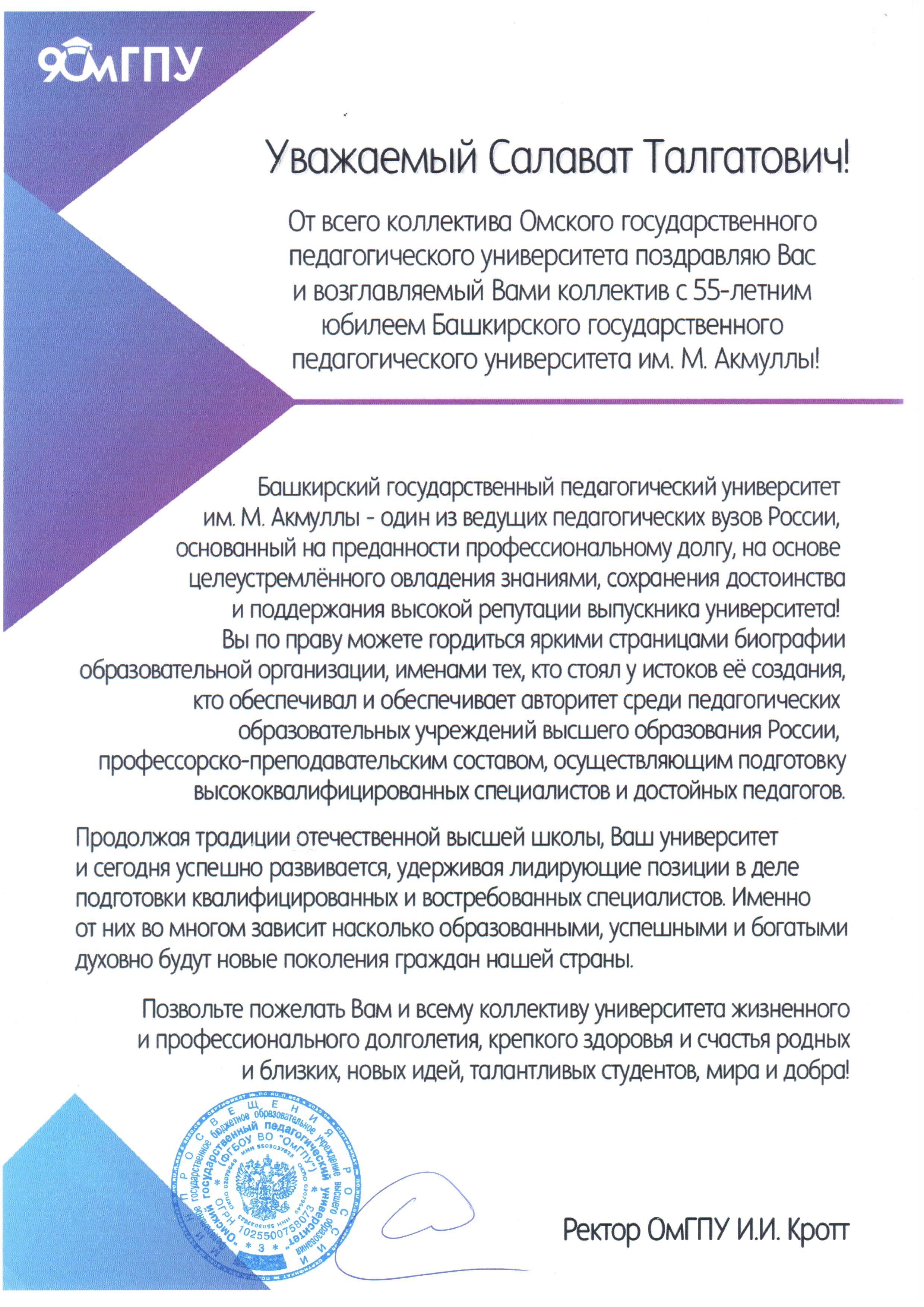 С 55-летием со дня основания Башкирского государственного педагогического университета имени М. Акмуллы поздравляет ректор Омского государственного педагогического университета Иван Иванович Кротт.