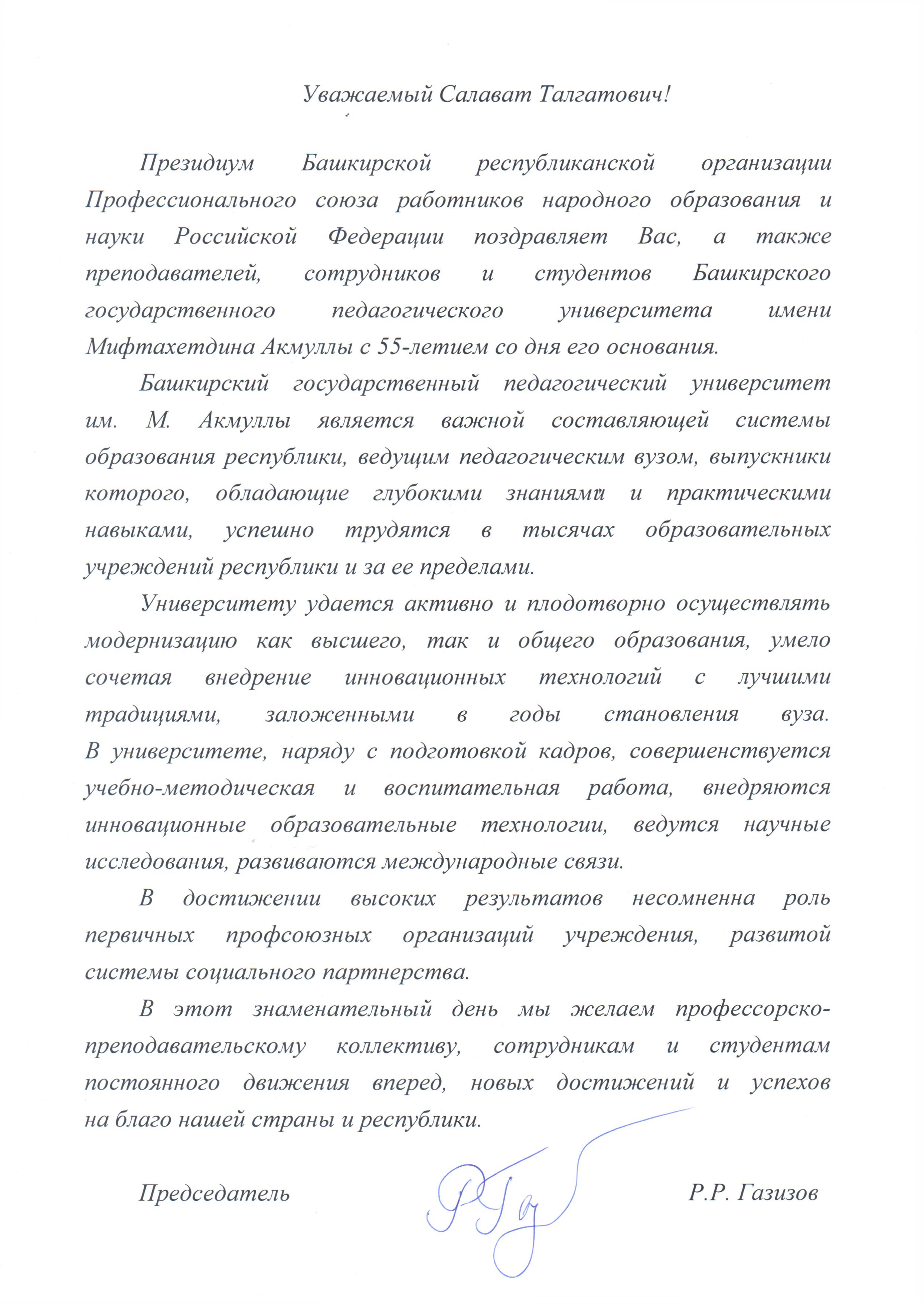 С 55-летием со дня основания Башкирского государственного педагогического университета имени М. Акмуллы поздравляет председатель Башкирской республиканской организации Профсоюза работников народного образования и науки Российской Федерации Газизов Раиль Робертович.