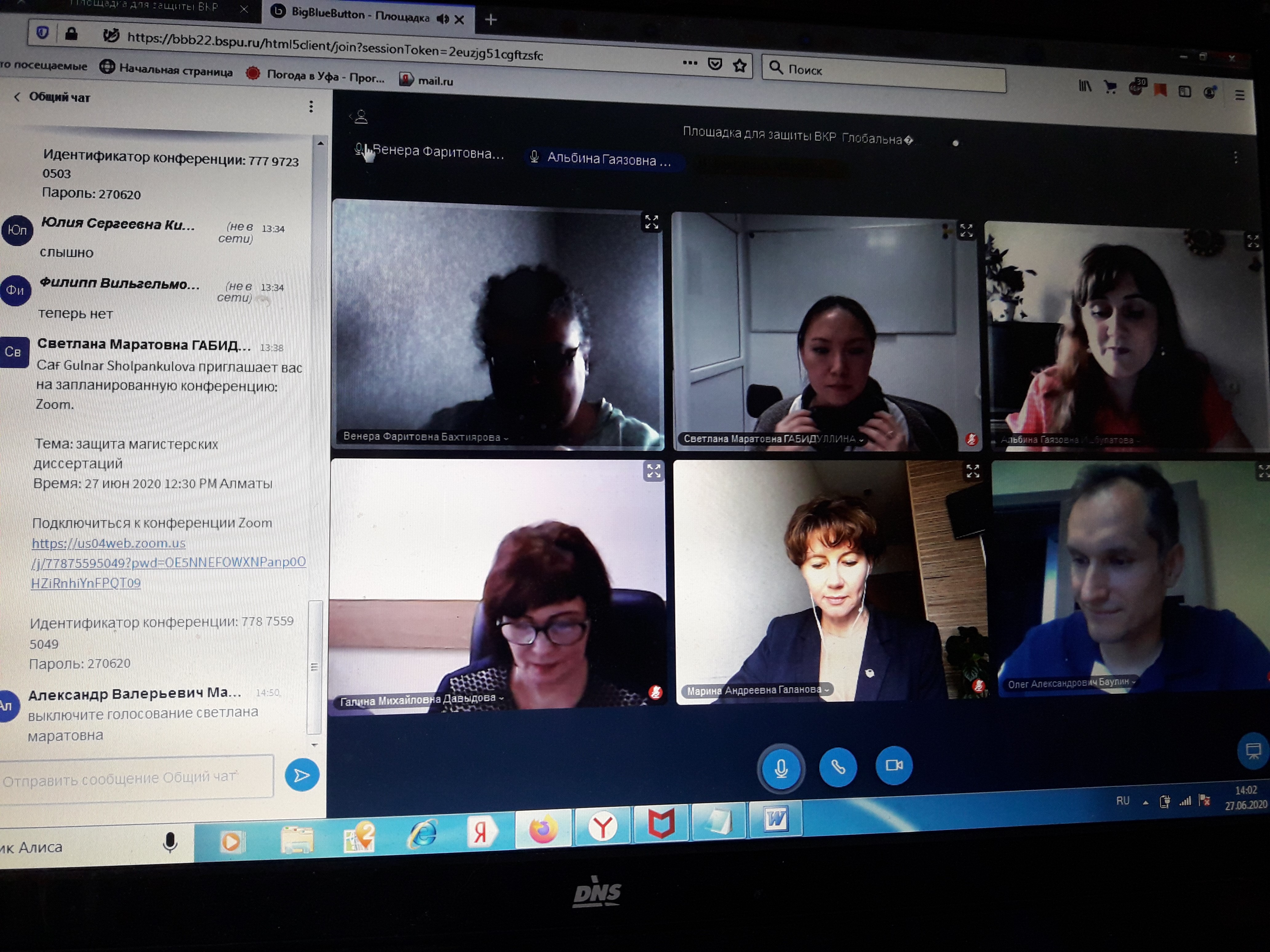 27 июня, в субботу на кафедре педагогики и психологии профессионального образования состоялась уникальная процедура защиты магистерских диссертаций по программе «Педагогика и психология высшей школы». Уникальна данная процедура тем, что защита не только проводилась в дистанционном формате (что, в общем-то, для БГПУ им.М.Акмуллы уже не ново), но и тем, что часть магистрантов программы оценивалась сразу двумя государственными экзаменационными комиссиями – со стороны Евразийского национального университета им. Л.Н. Гумилева и БГПУ им. М.Акмуллы. Хотелось бы отметить, что подобная процедура защиты ВКР магистрантов комиссиями двух вузов-партнеров УШОС проводится уже пятый год.