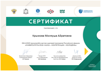 Участие в деловой программе Российского форума "Университеты 2030: НАУКА-КОМПЕТЕНЦИИ-МОЛОДЕЖЬ". Состоявшегося 06.11.2020, приняли участие преподаватели кафедры педагогики и психологии профессионального образования: д.п.н., профессор, Сергиенко И.В., к.п.н., доцент, Вахидова Л.В., соискатель кафедры Крымова М.А.