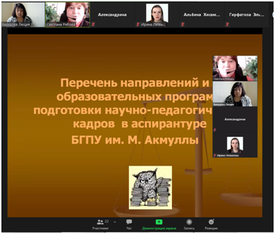 27.04.2021 в рамках профориентационной работы проведена презентация научных школ и образовательных программ аспирантуры по педагогическим наукам для преподавателей колледжей РБ.