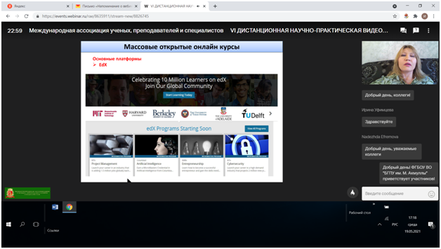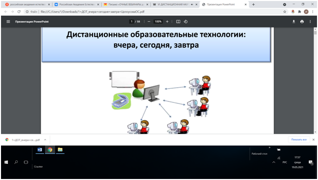 19 мая 2021 года канд.пед.наук, доцент кафедры профессионального и социального образования Цилюгина И.Б. приняла участие в работе VI Международной дистанционной научно-практической конференции «Современные проблемы школьного образования», организованной Российской Академией Естествознания (Международная ассоциации ученых, преподавателей и специалистов). На конференции обсуждались вопросы использования дистанционных образовательных технологий (проблемы и риски), особенности дистанционной образовательной деятельности, основные принципы обучения в Болонской системе.