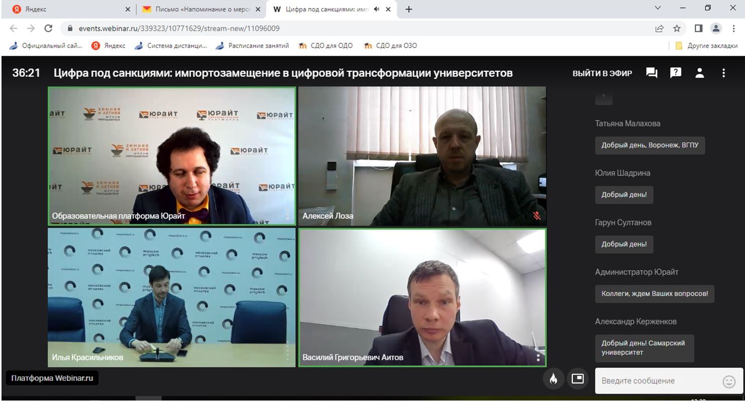 13 апреля 2022 года на базе Образовательной платформы «Юрайт» проводилась онлайн-дискуссия "Цифра под санкциями: импортозамещение в цифровой трансформации университетов". Старший преподаватель кафедры профессионального и социального образования, Габидуллина Светлана Маратовна, приняла участие в онлайн-дискуссии.
