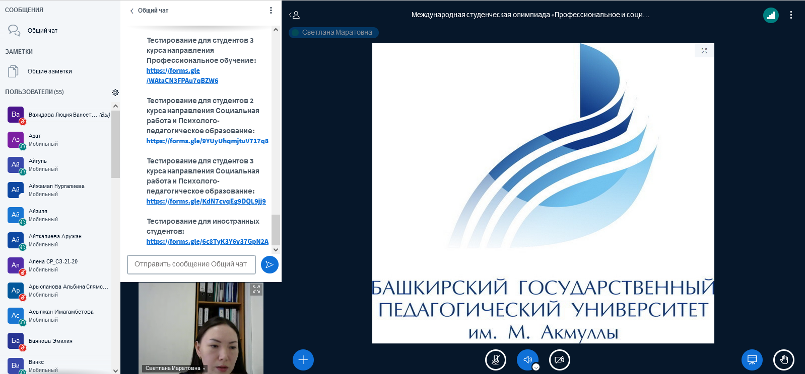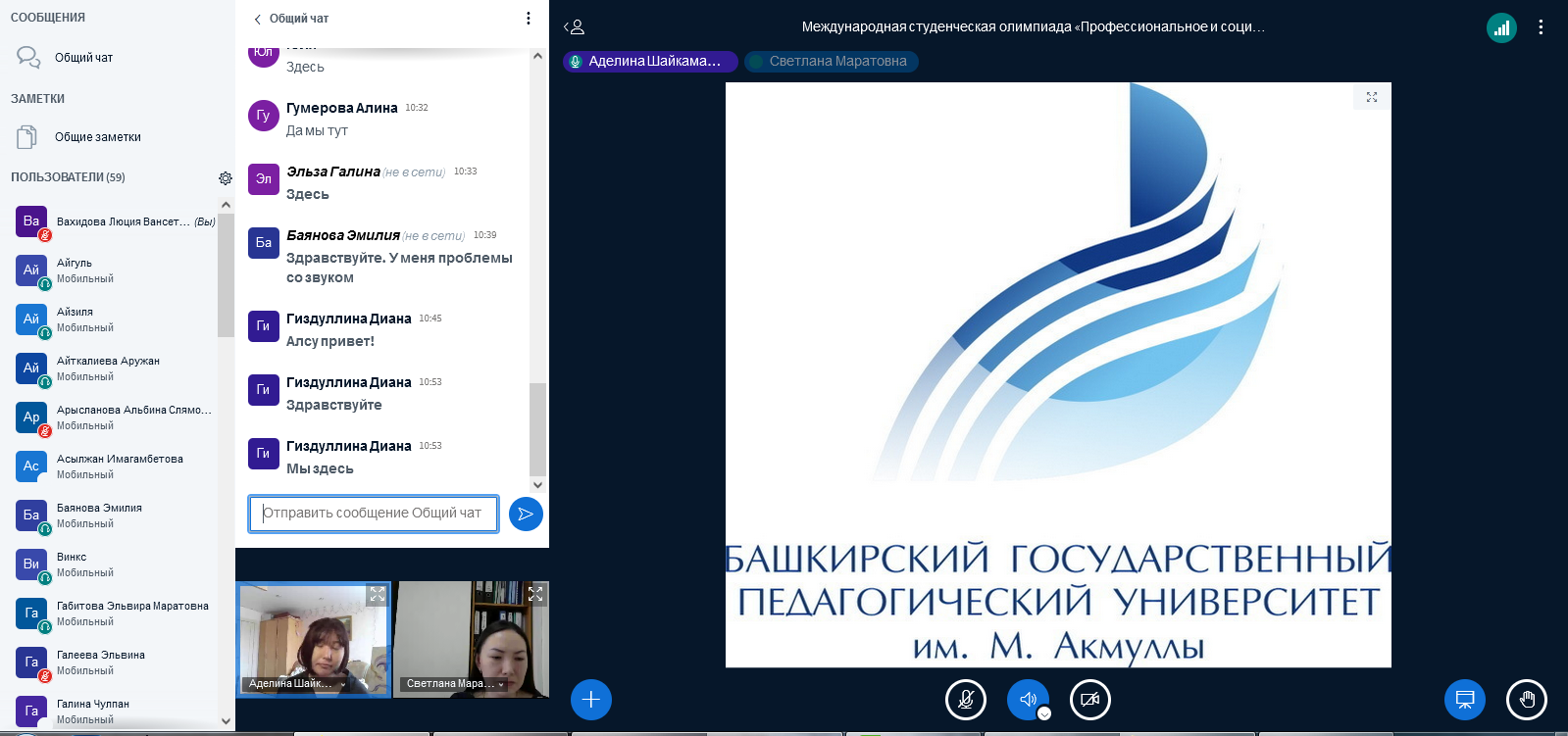 21 апреля 2022 года в БГПУ им. М. Акмуллы прошла международная студенческая олимпиада «Профессиональное и социальное образование», которая объединила более 50 человек из разных высших учебных заведений России и стран СНГ. Участниками стали студенты из Башкирского государственного педагогического университета имени М. Акмуллы, а также Актюбинского университета им. С. Баишева.