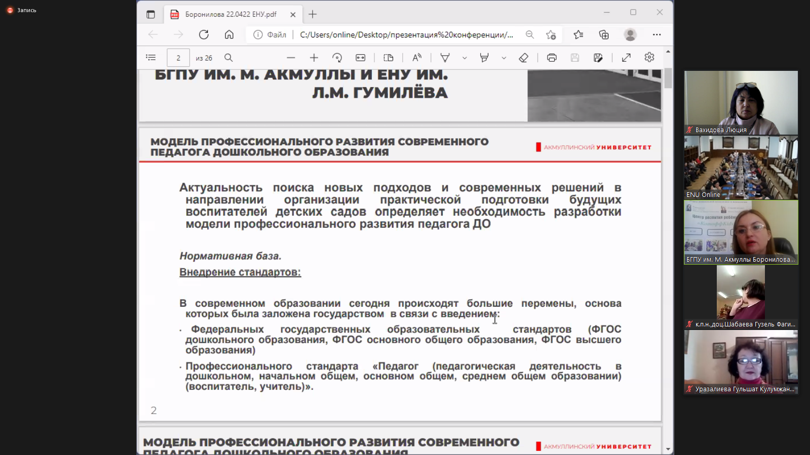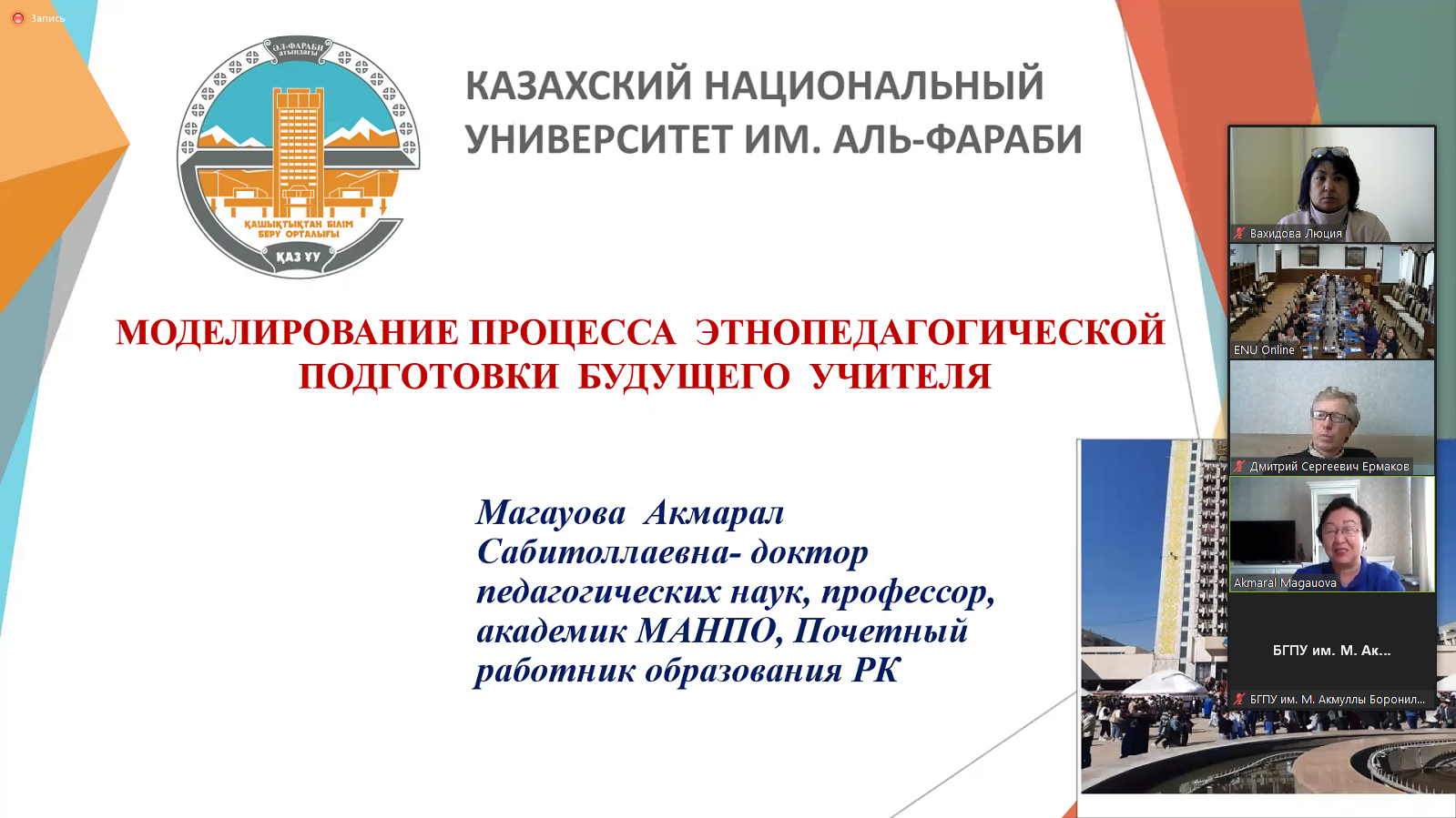22 апреля 2022 года Евразийский национальный университет им. Л.Н. Гумилева провел Международную научно-практическую конференцию «Современное общество и педагогическое образование», посвященную 60-летию кафедры «Педагогика». В пленарной части выступила Вахидова Л. В. – к.п.н., доцент, заведующая кафедрой профессионального и социального образования, с темой "Персонализация как фактор успешной подготовки специалиста в информационно-образовательной среде вуза".